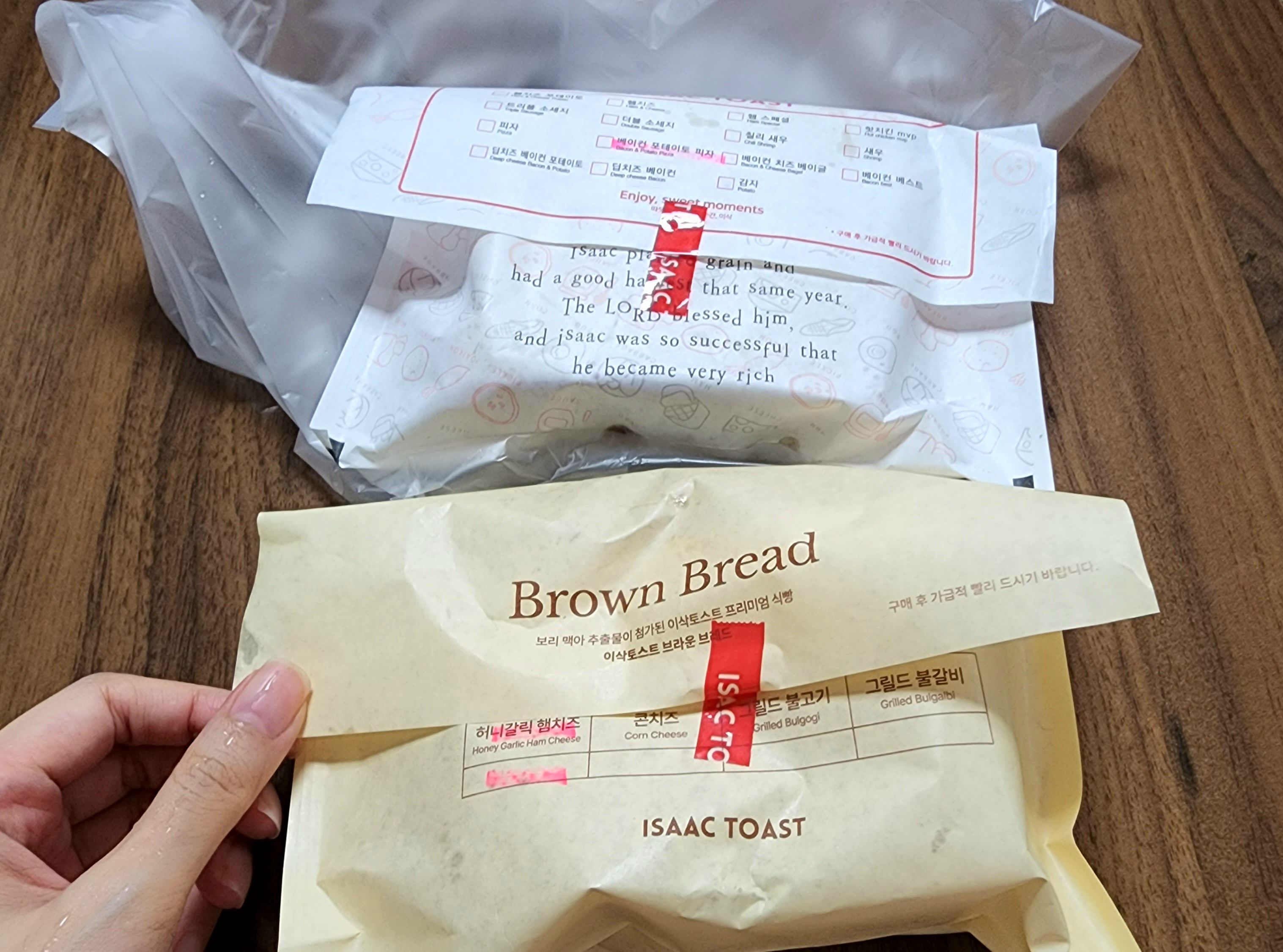 허니갈릭햄치즈는 브라운브레드(보리 맥아 추출물이 첨가된 이삭토스트 프리미엄 식빵)을 이용한 메뉴라서 포장지도 약간 브라운 색상이었다. 베이컨포테이토피자는 일단 포장지!
