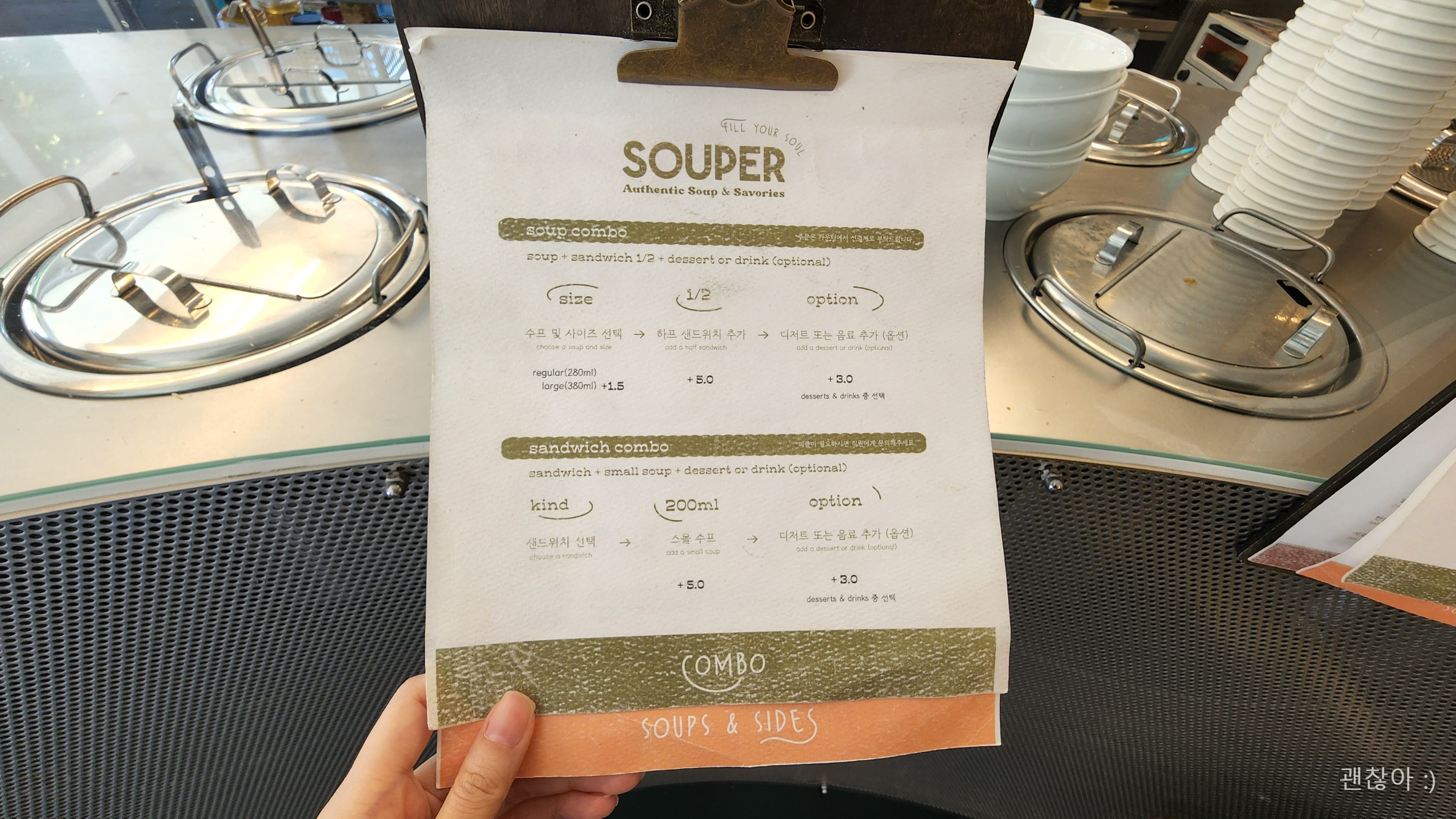 일단 수퍼는 공덕역에도 매장이 있는 체인점이다. 우리나라에 이렇게 전문 수프집을 찾기 힘든데 회사 근처에 있어서 호기심에 방문하게 되었는데 그 때 바로 반하게 되었다. 가격대는 꽤 있는 편이지만 한 번 맛보면! 그리고 수프 좋아하신다면! 샌드위치+수프 세트 맛보면 계속 생각나게 된다.