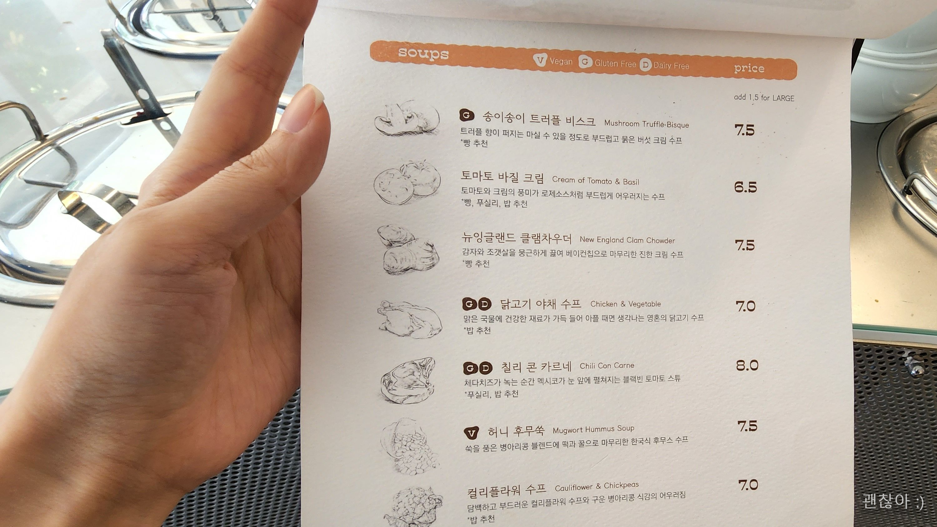 - 수프 : 송이송이 트러플 비스크(7,500원), 토마토 바질 크림(6,500원), 뉴잉글랜드 클램차우더(7,500원), 닭고기 야채 수프(7,000원), 칠리 콘 카르네(8,000원), 허니 후무쑥(7,500원), 컬리플라워 수프(7,000원)