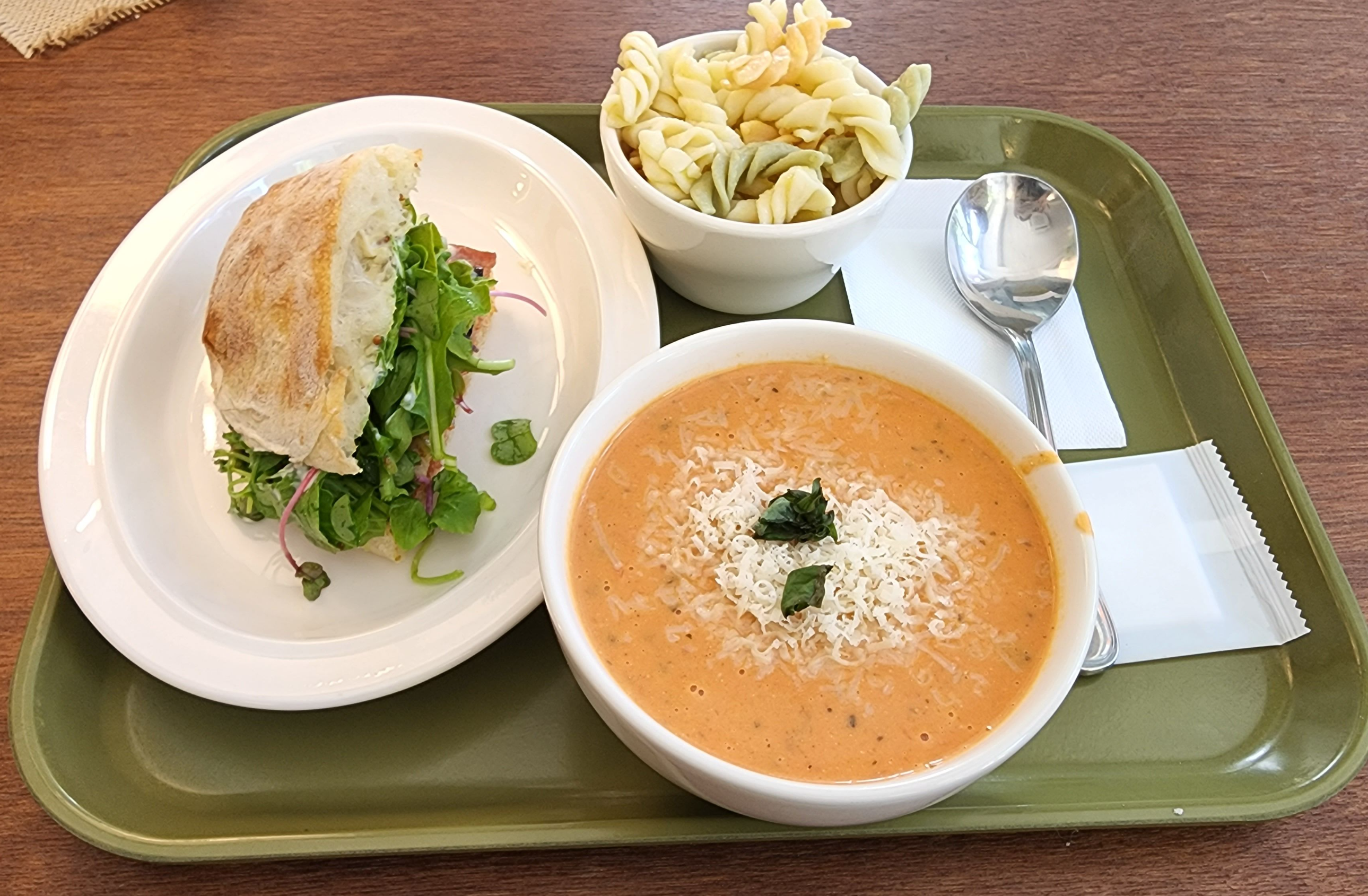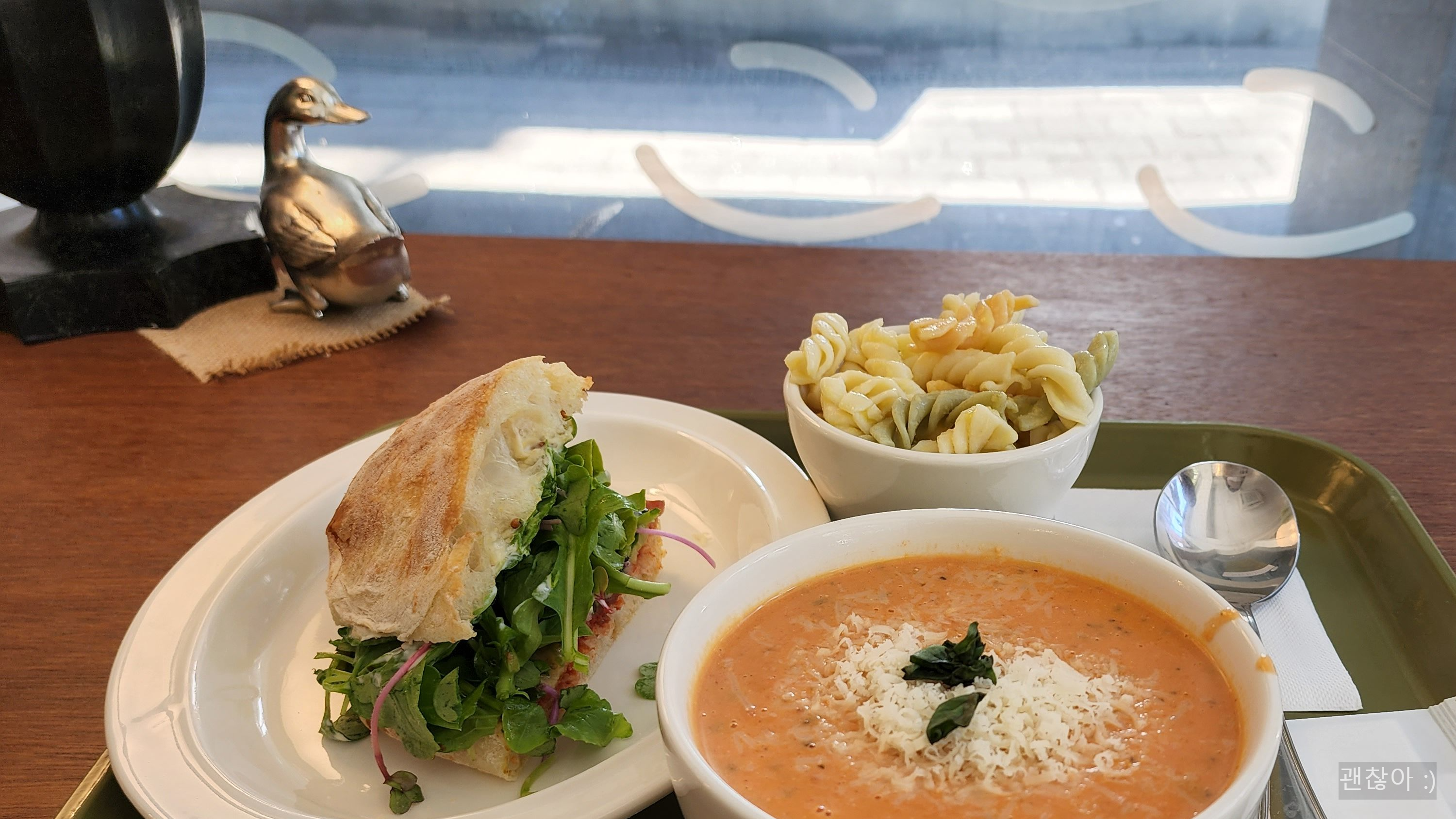 수프는 끓여놓은 걸 담아서 나오는 형태라서 오래 걸리지 않아 바로 먹을 수 있었다. 나의 최애!!!!! 토마토 바질 크림 수프 (푸실리 면 추가) + 베이컨 가지 샌드위치 세트를 먹었다. 이렇게 봤을 땐 양이 별로 안많아 보이는데 먹으면 진짜 배부르다.