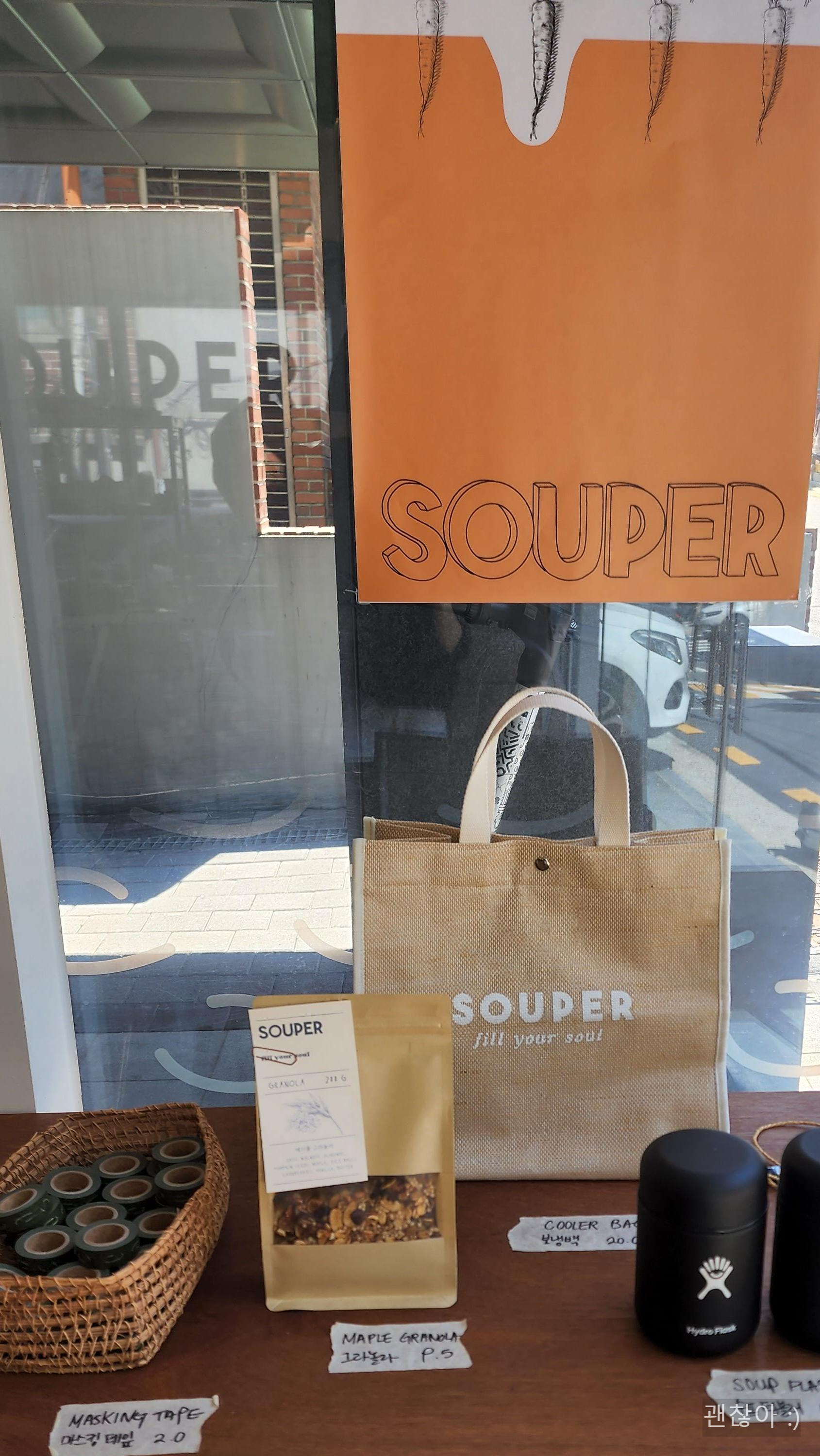 입구 쪽에는 이렇게 SOUPER 굿즈도 판매하고 있다. 수프 텀블러 너무 귀여운 거 아닌가요?🧡