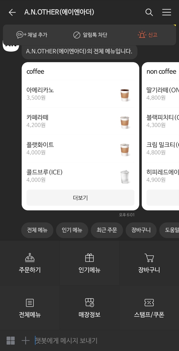 카카오톡 친구에 "에이엔아더"를 검색하면 전체 메뉴/인기 메뉴 모두 확인 가능하고 여기서 바로 주문(결제 포함) 가능하다. 점심에는 사람이 진~짜 많으니 무조건 가시는 길에 미리 주문하시는 걸 추천한다. 첫 방문이었지만 여러 후기를 통해 카카오톡 주문을 하니 12번째로 음료를 준비할 거라는 안내를 확인하고 가게를 방문하니!
