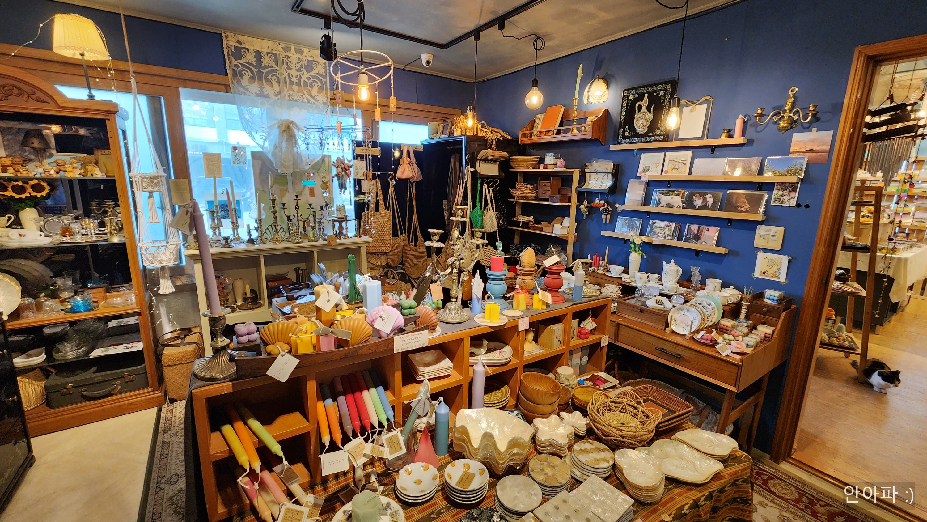 가게는 크게 2개 공간으로 나눠져 있는데 한쪽 공간은 빈티지 제품들이 모여있다. 빈티지 컵/촛대들이 있고, 라탄 소품 조금, 악세사리, 옷, 가방 등이 있다. 인센스스틱과 인센스 용품들도 볼 수 있다.