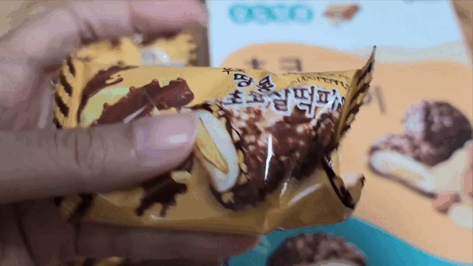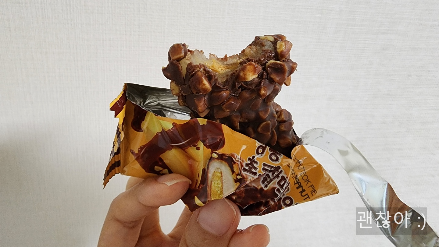 일단 직원분이 무조건 제일 맛있고 추천한다고 말씀 주셨던 우도땅콩 초코찰떡파이를 살펴보았다. 봉지를 뜯어보면 초코로 뒤덮인 찰떡파이인데 우도땅콩이 박혀있다고 생각해주시면 된다. 안에도 우도땅콩이 들어가 있는데 초코+땅콩맛 찰떡파이라서 맛이 없을 수 없는 맛이다. 호불호 없이 먹을 수 있다.