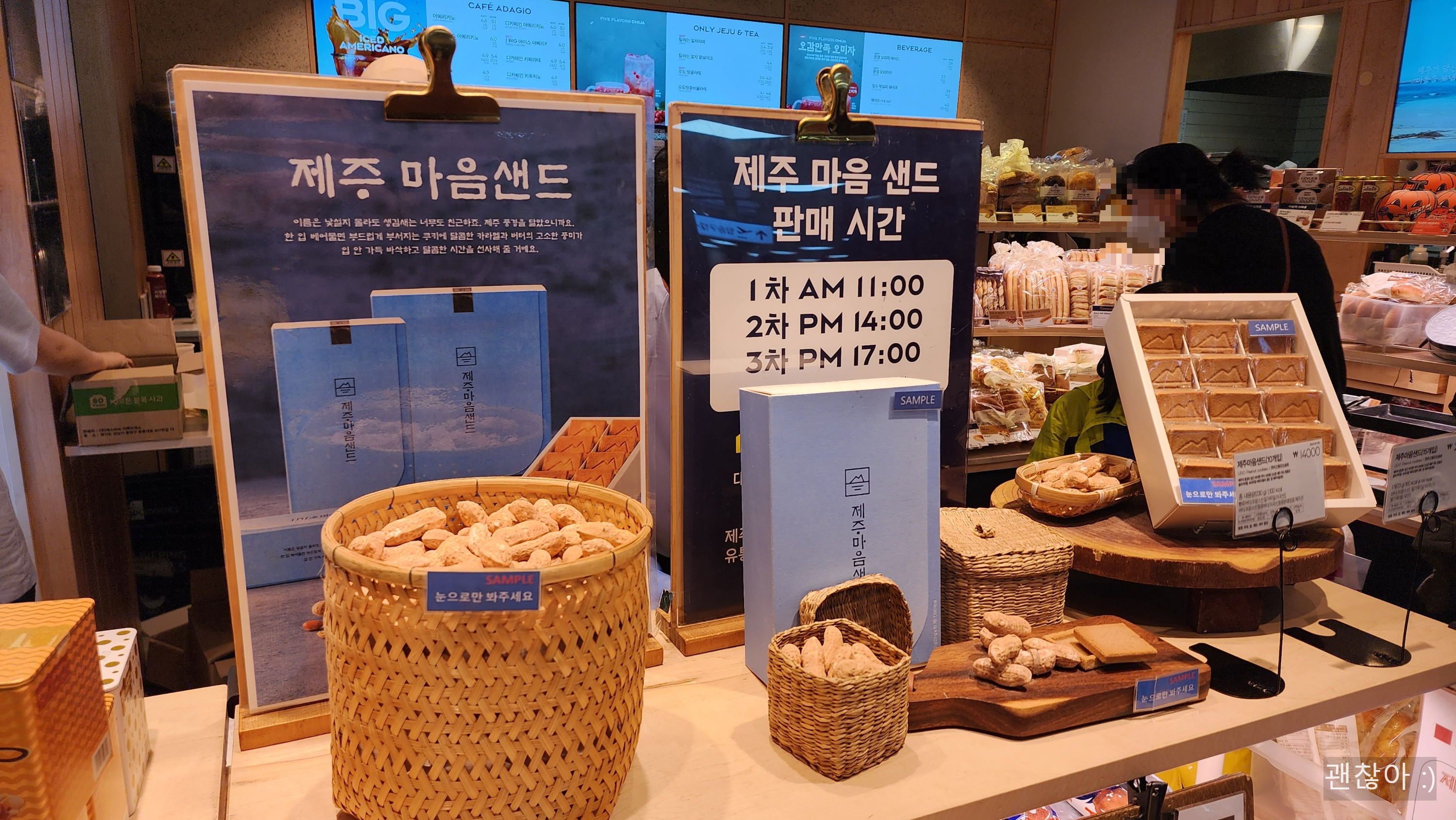 맨 처음에는 다들 제주에 오면 파리바게뜨 제주마음샌드를 사간다고 해서 그걸 사갈까 했다. 공항에 파리바게트가 2개 있는데 1개는 검사하기 전 밖에, 1개는 검사한 후 면세점 쪽에 있다. 두개 지점의 판매시간이 다르니 참고해주시기 바라며 나는 바깥에서 살까 했는데 줄이 너무 길어서 '이렇게까지 기다려서 사야 하나? 그냥 사지 말거나 안에 들어가 보자!'란 마음으로 줄 선 사람들을 구경하고 공항 안쪽으로 들어왔다.
