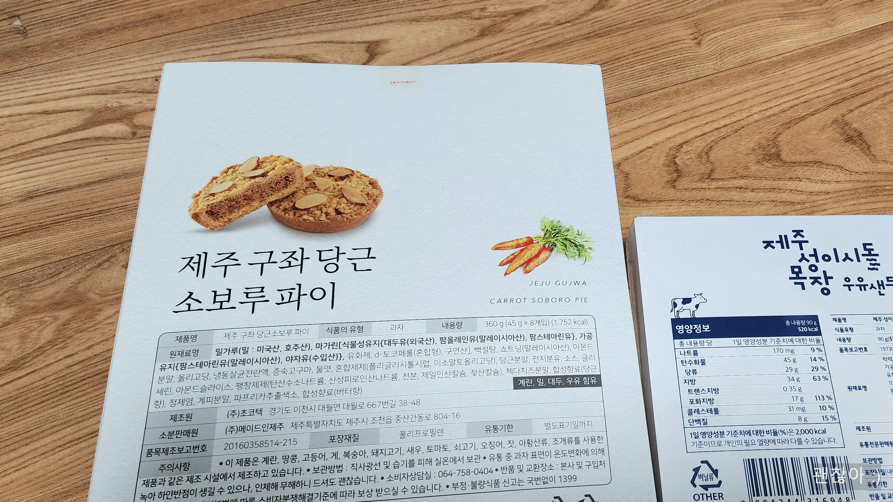 성이시돌 우유샌드와 제주 구좌당근소보루파이 안은 이렇게 생겼다.