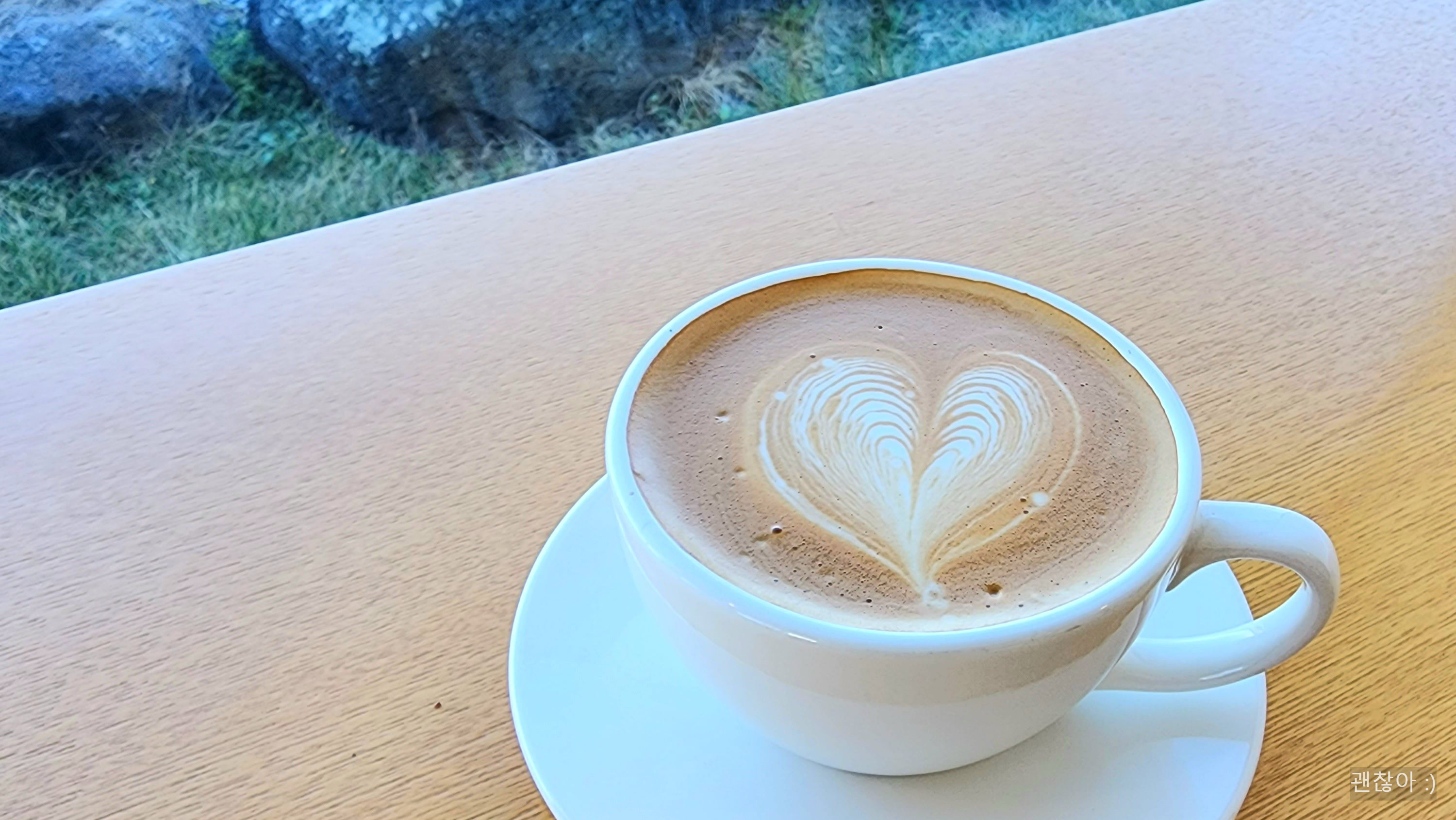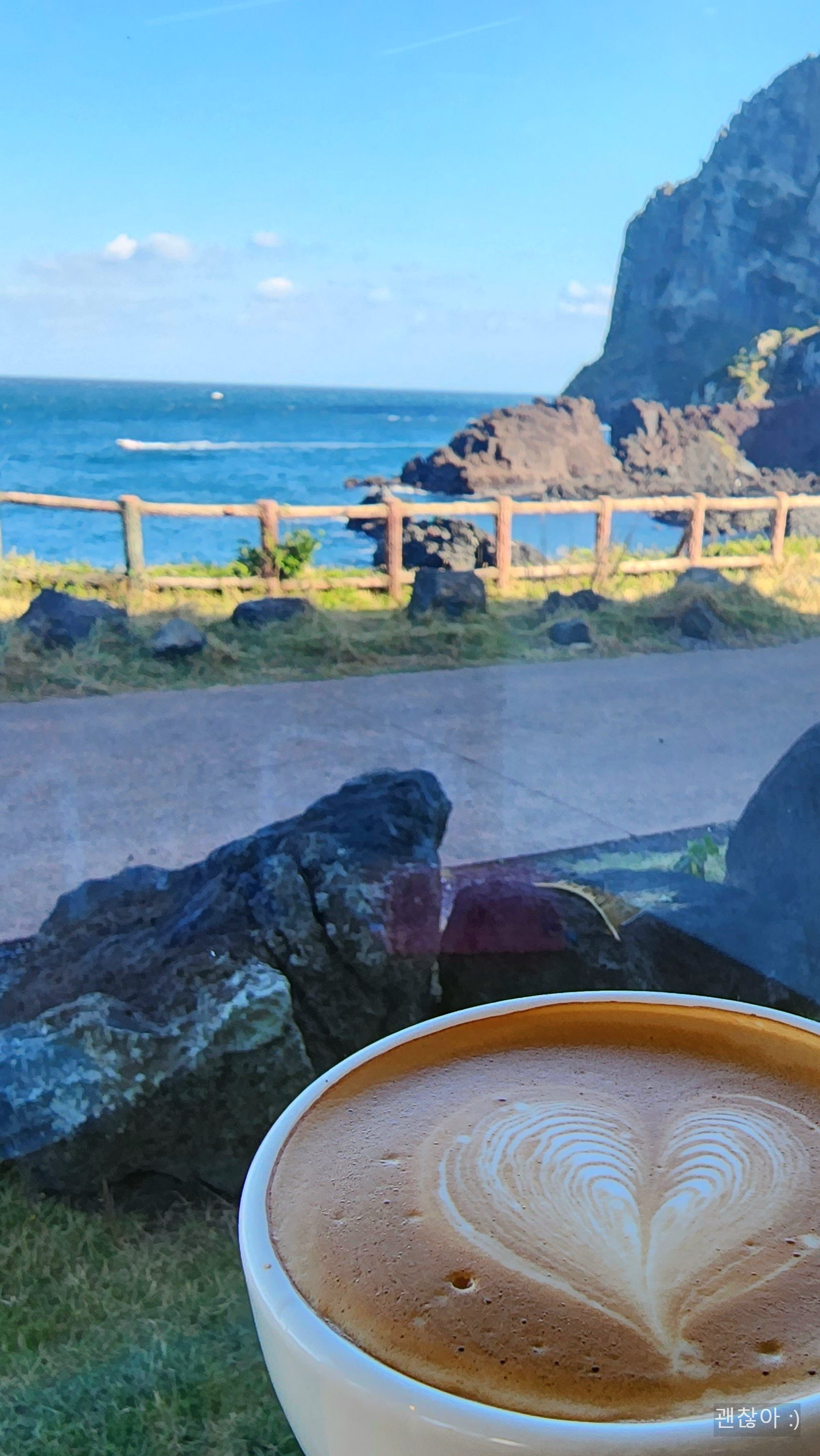 기다리다 보니 나온 나의 디카페인 라떼! 나는 일반 커피를 안먹기 때문에 디카페인 원두 선택이 가능하면 엄~~청 반가워하는데 여기도 그러했다. 앞에는 아름다운 제주 바다, 커피는 따땃하니 너무 기분이 좋고 행복했다.