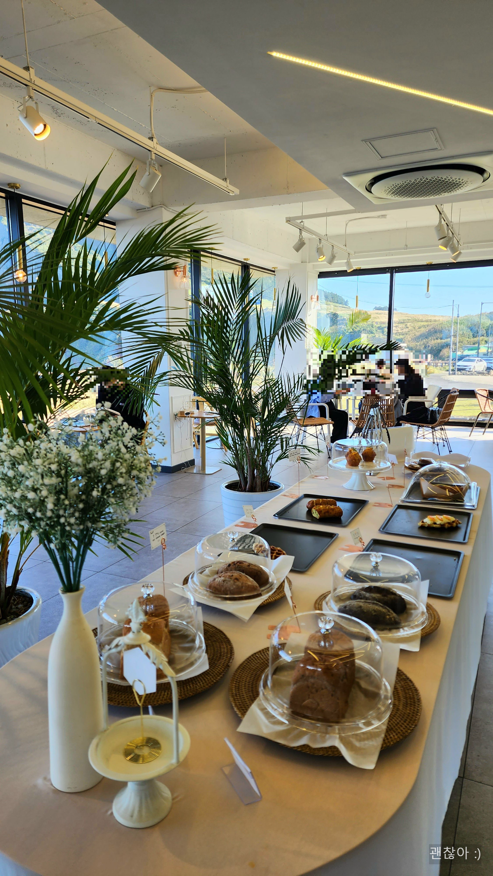 카페는 통창과 밝은 인테리어 + 초록초록 화분들이 조화를 이루고 있었고 깔끔하면서도 예뻤다.