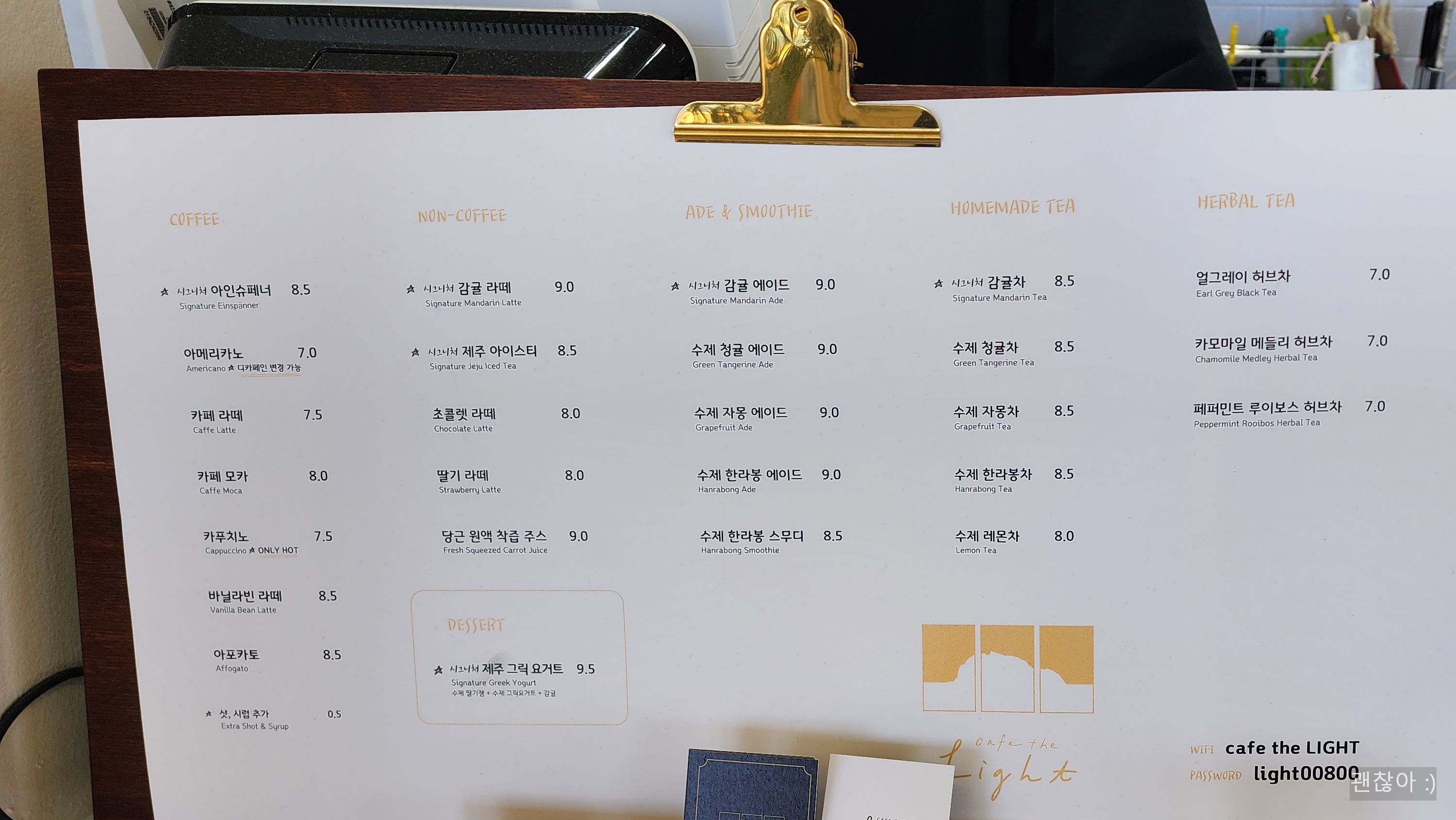 - 커피 : 아인슈페너(8,500원), 아메리카노(7,000원), 카페라떼, 카페모카, 카푸치노, 바닐라빈라떼, 아포카토