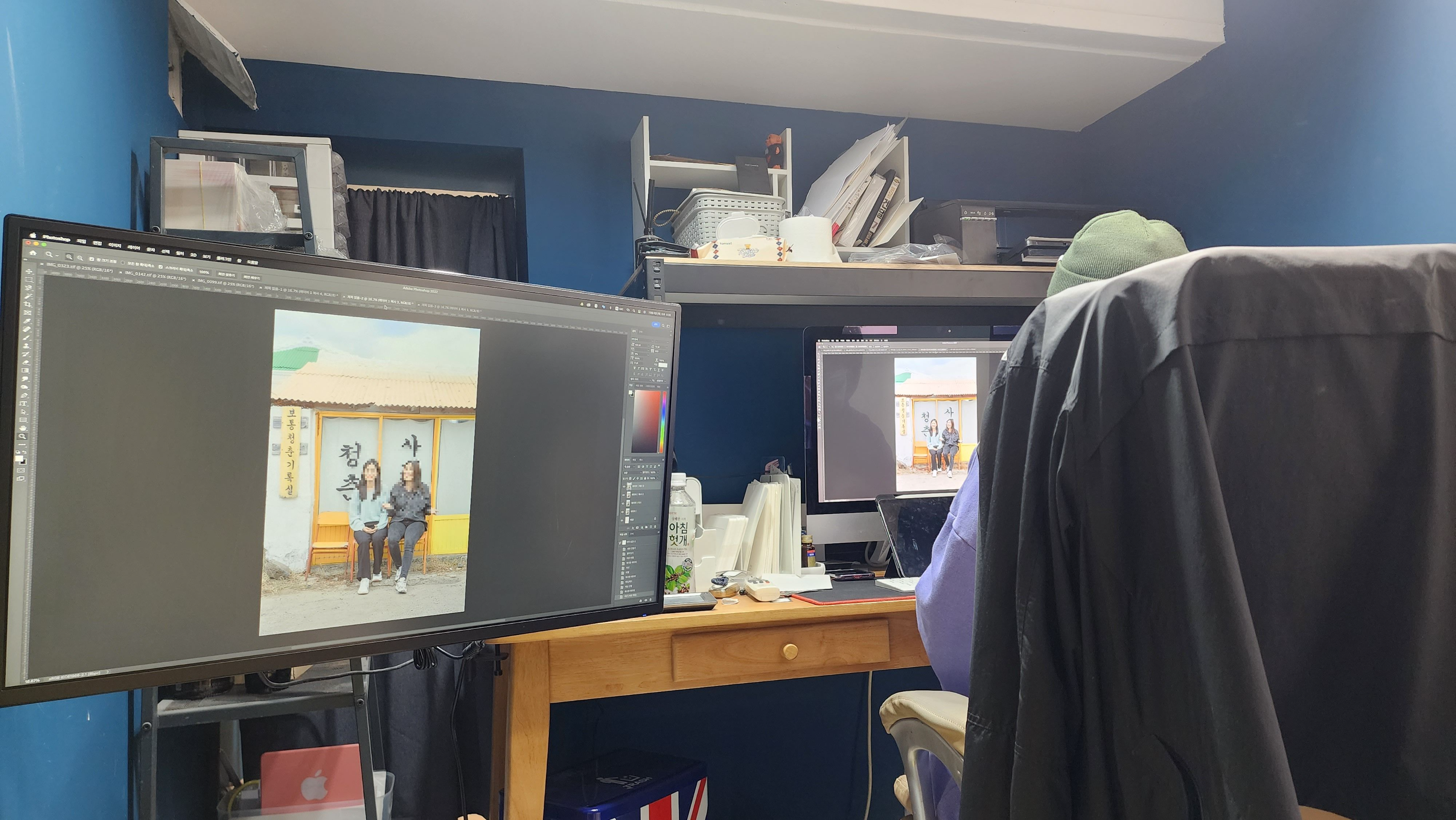 나는 앞머리가 바람에 휘날려서 친구 머리와 연결된 것 같은 부분을 살짝 다듬어주셨고 친구는 금니가 너무 잘 보여서 그 부분만 숨겨주셨다. 금니 보정할 때 진짜 너무 웃겨서 (이유 : 엄청나게 크게 확대된 금니를 모니터 2개로 확인하는데 친구와 나 모두 웃음을 감출 수 없었다) 이 과정도 진짜 재밌었다. 작가님의 친절함과 유머가 모든 시간을 즐겁게 만들어주었다. 다른 이야기지만, 나는 완벽한 I라 사람들 만나는 거, 특히 새로운 사람 만나는 거 좋아하지 않는다. 기가 빨린다. 근데 요즘 자신의 마음이 단단한, 그래서 다른 사람들을 포용할 수 있는 사람들을 만나면 나 또한 쉽게 편해진다는 걸 알게 되었다. 작가님은 그런 분이신 것 같았다.