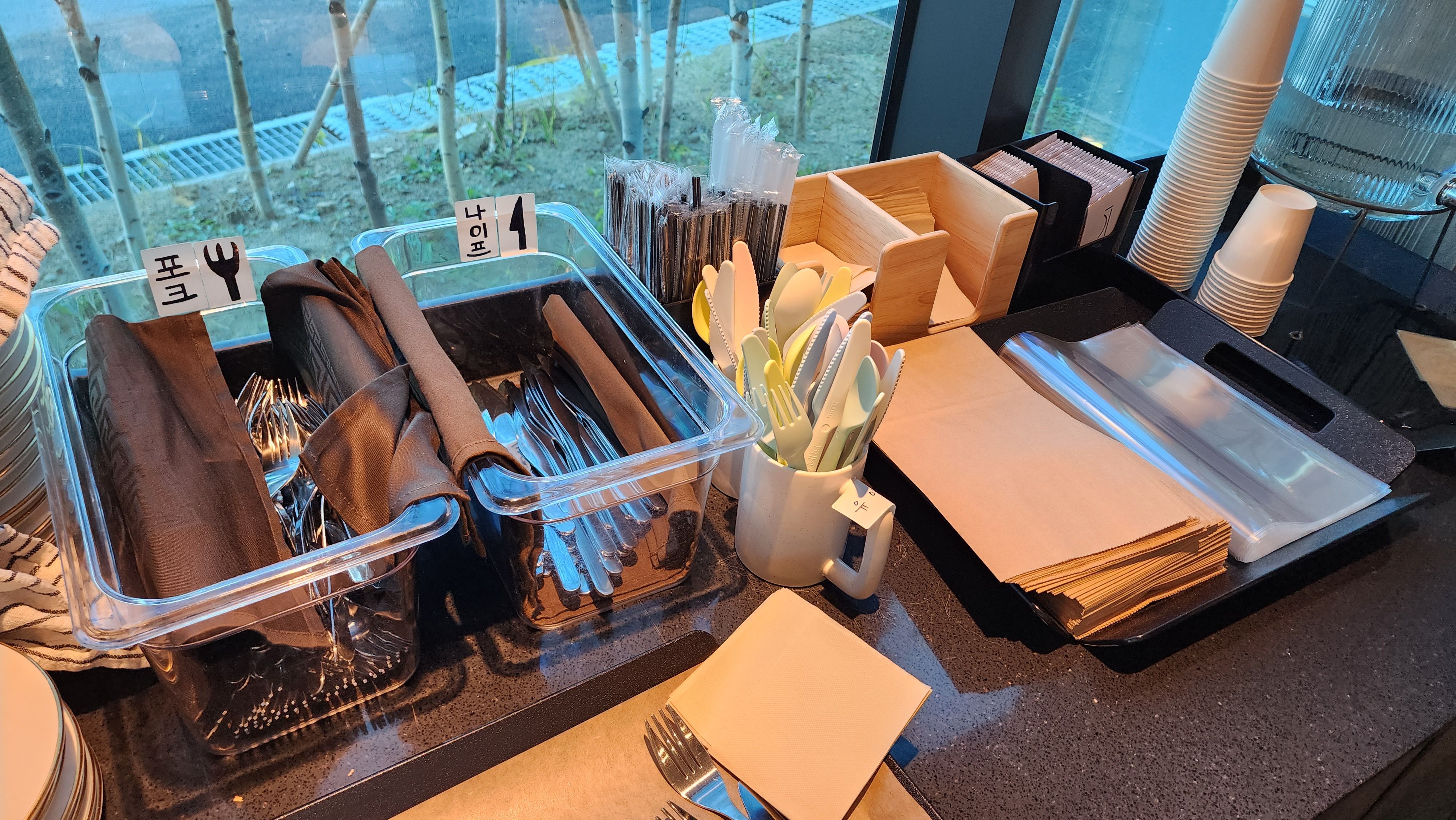 한쪽에는 포크, 나이프, 남은 빵을 가져갈 수 있는 포장용기도 마련되어있다.