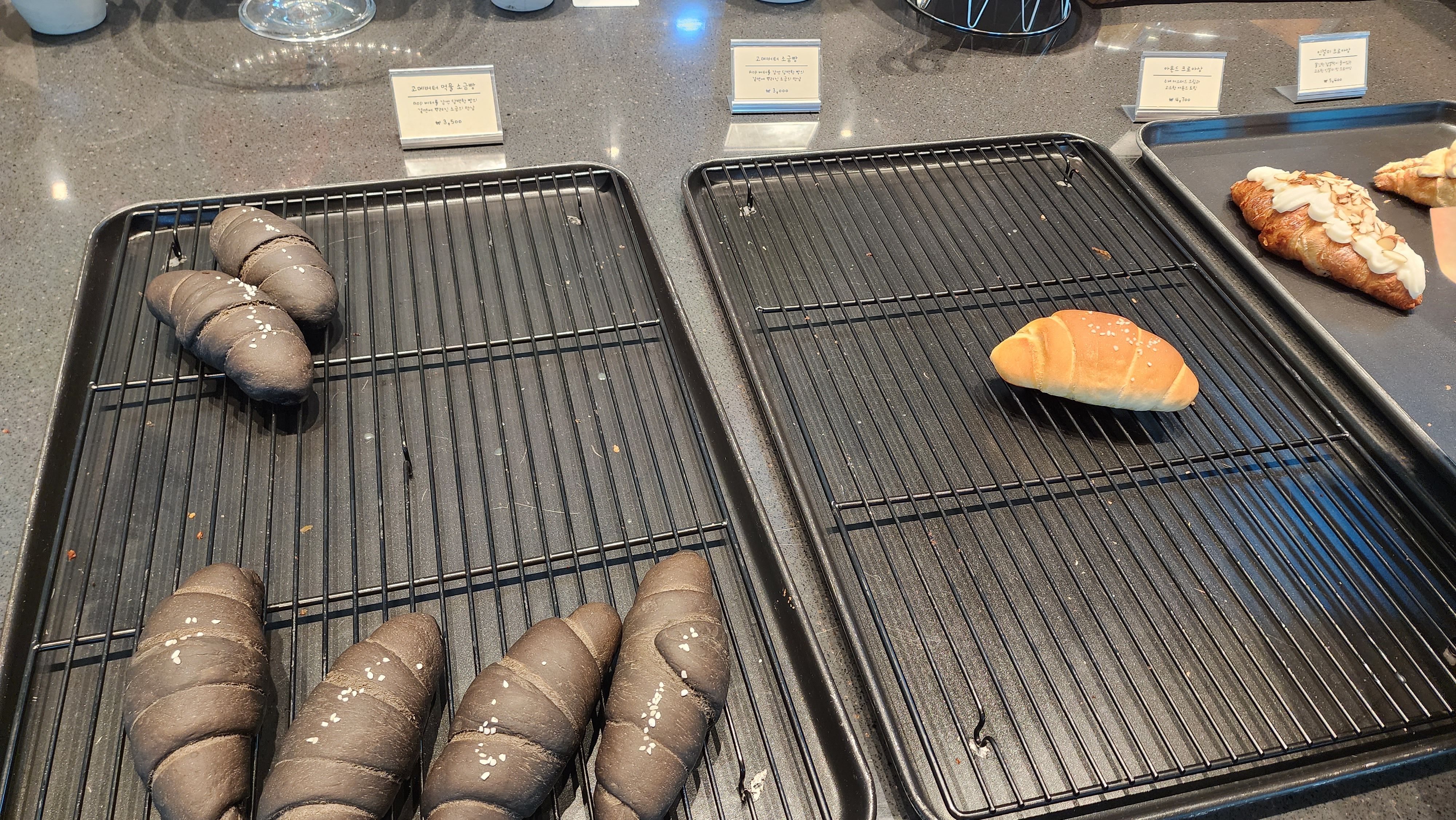 가장 먼저 베이커리 메뉴를 살펴보았다. 빵 종류가 엄~청 많은 건 아니지만 맛있어 보이는 것들이 너무 많았다. 우리는 그중에 인절미 크로와상을 선택했다.