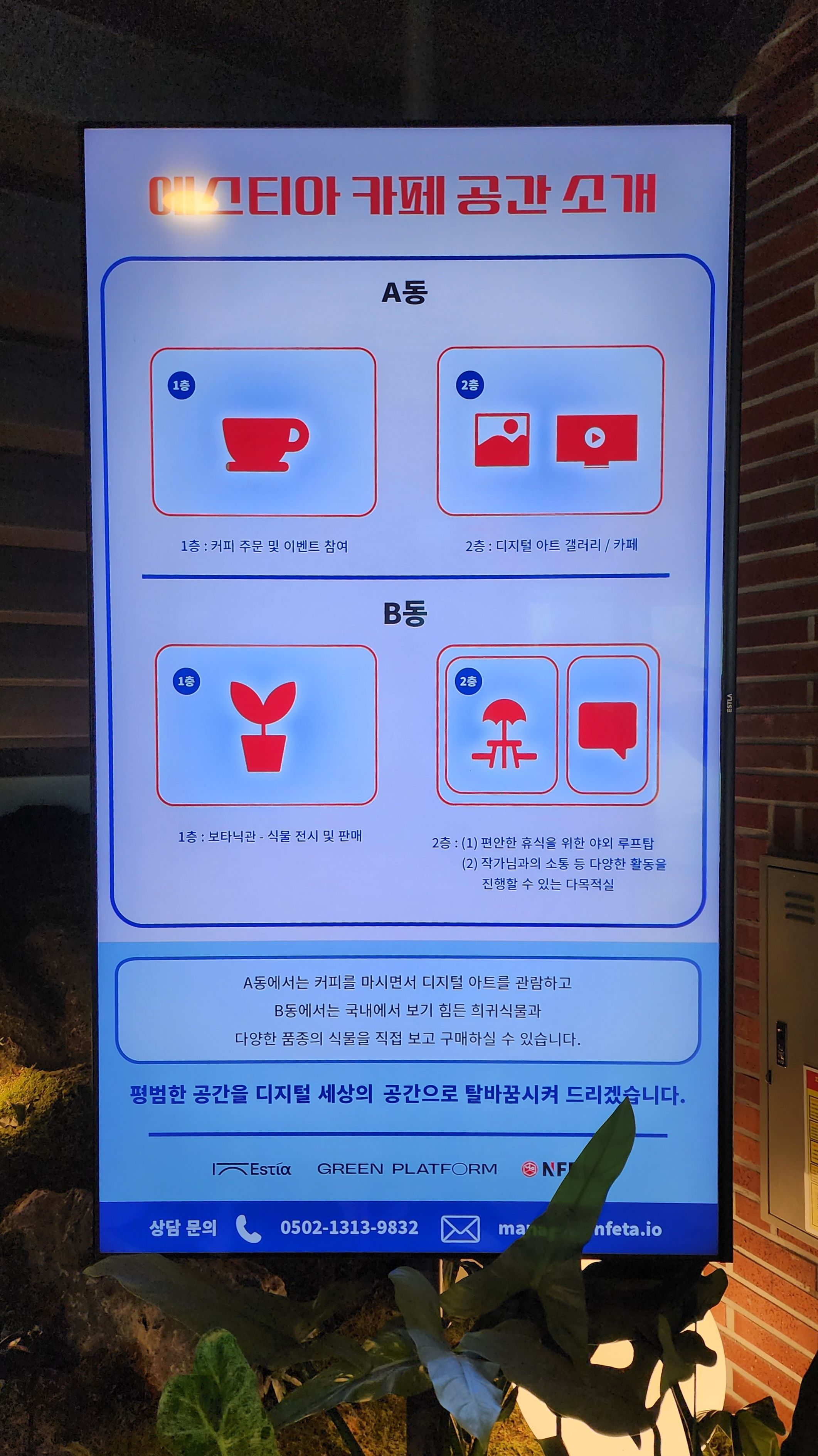 몇 차례 글을 썼었지만 용인 남사 화훼단지를 주기적으로 가는 편이다. 이번에도 들렸다가 목도 마르고, 약간 출출해서 카페를 알아봤는데 NFT 식물원카페 에스티아를 발견! NFT 카페는 무엇일까 호기심을 가지고 방문하게 되었다.