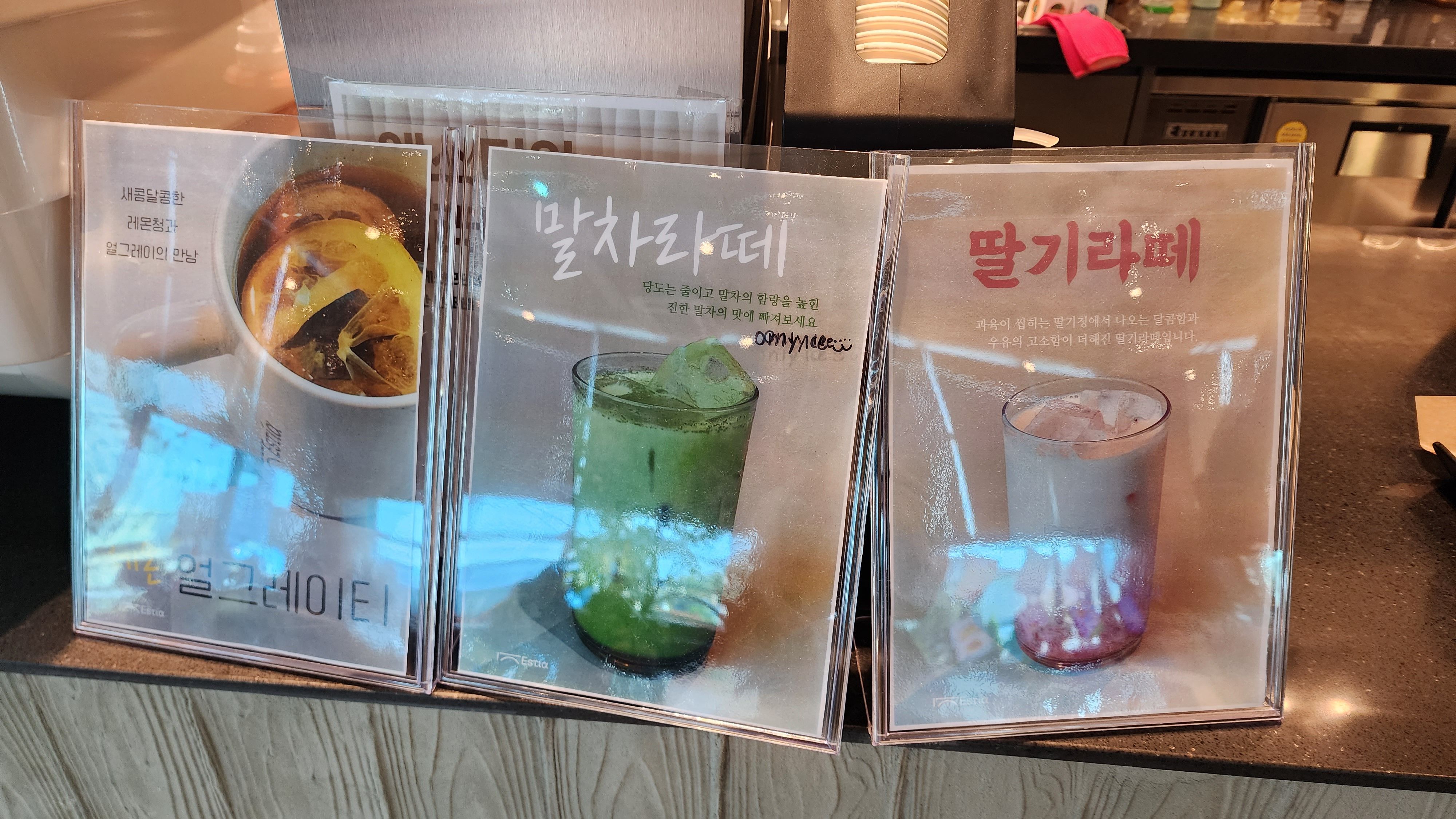 그 다음은 음료 주문! 음료를 주문하는 곳에 가보니 케이크, 마카롱도 있어서 깜짝 놀랐다. 당근케이크가 먹고 싶었지만 일단 꾹 참고 음료를 살펴보았다.