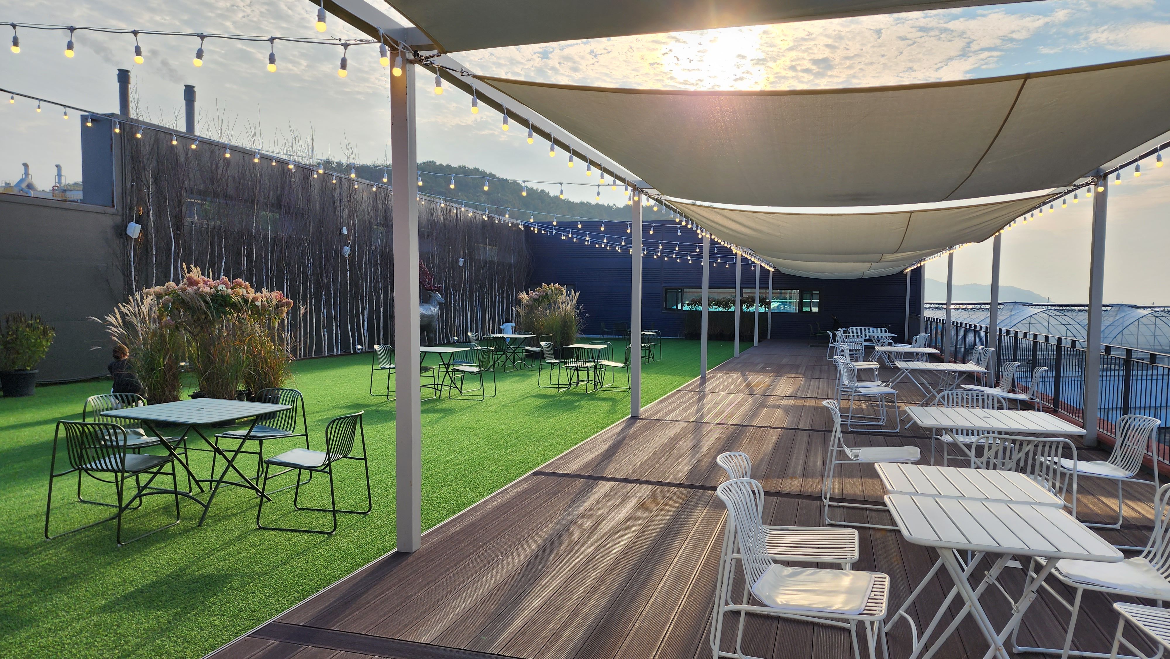 바깥으로 나가는 문으로 가면 이렇게 옥상정원 공간도 크게 마련되어있다. 원래는 여기서 앉아서 먹으려고 했으나 날파리가 너무 많아서 포기하고 들어왔다. 벌레 없는 시기에는 여기서 음료를 즐기시는 것도 좋을 것 같다.