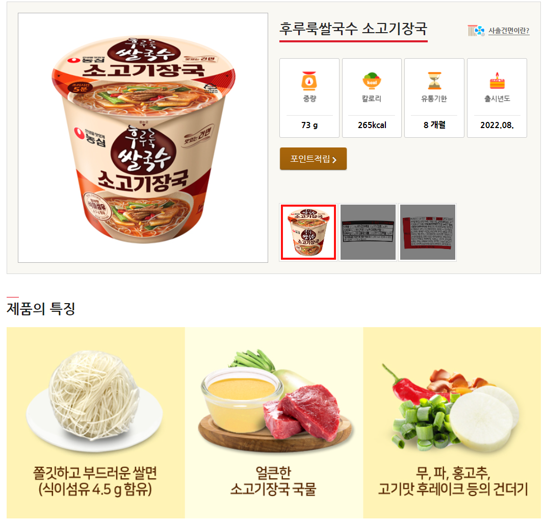 | 소고기장국 | 73g | 265kcal | 8개월 | 2022년 8월 |