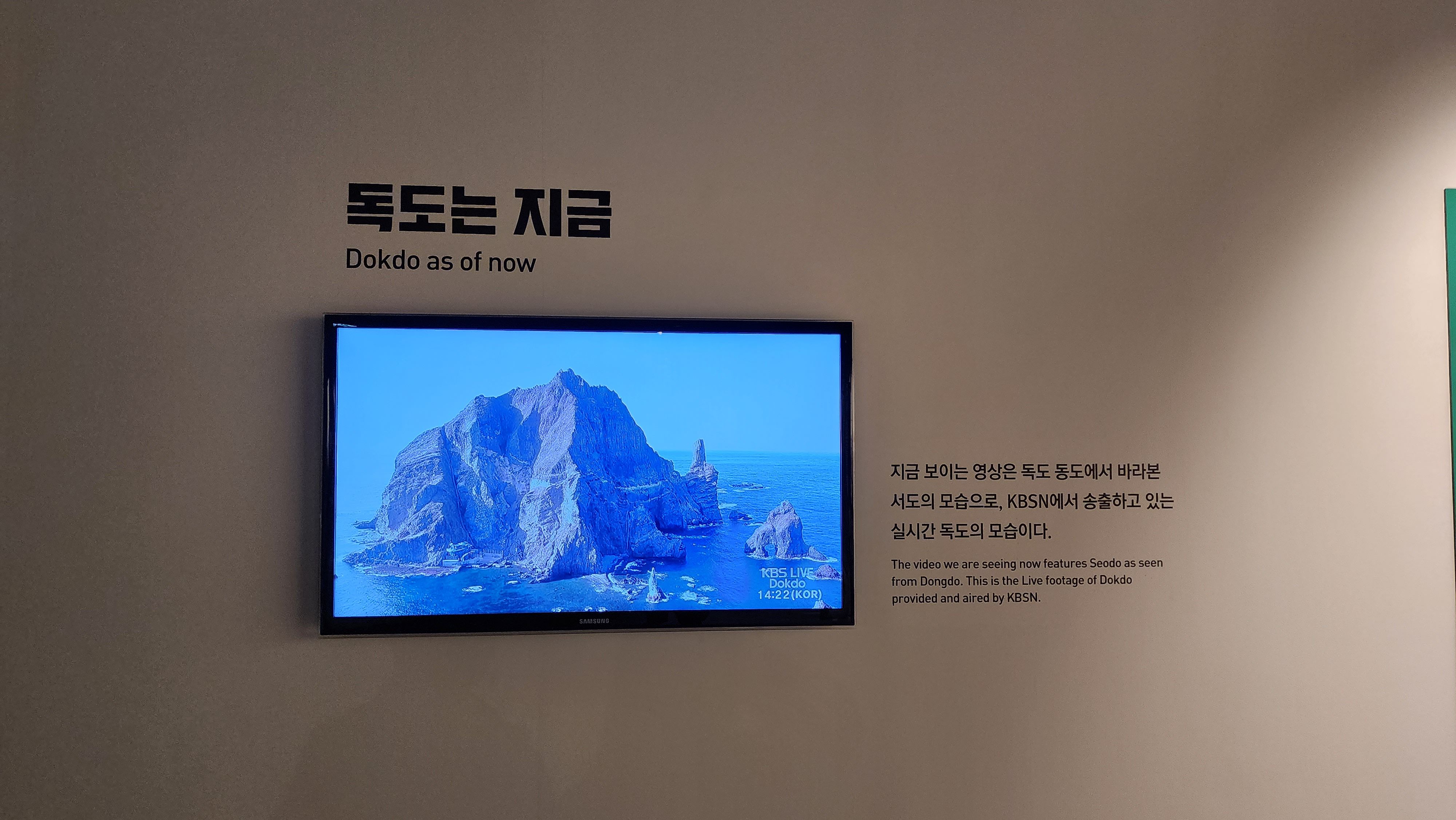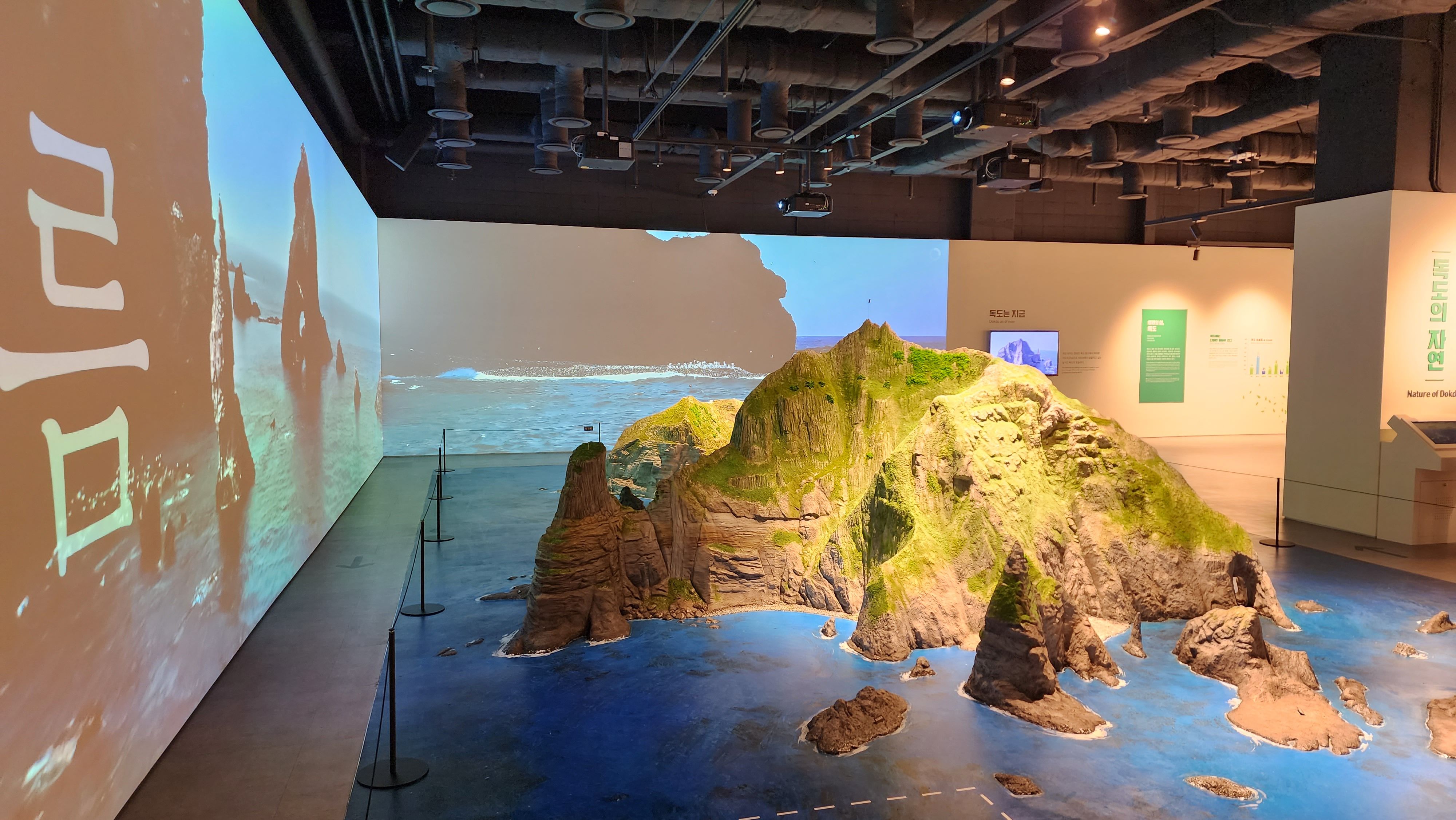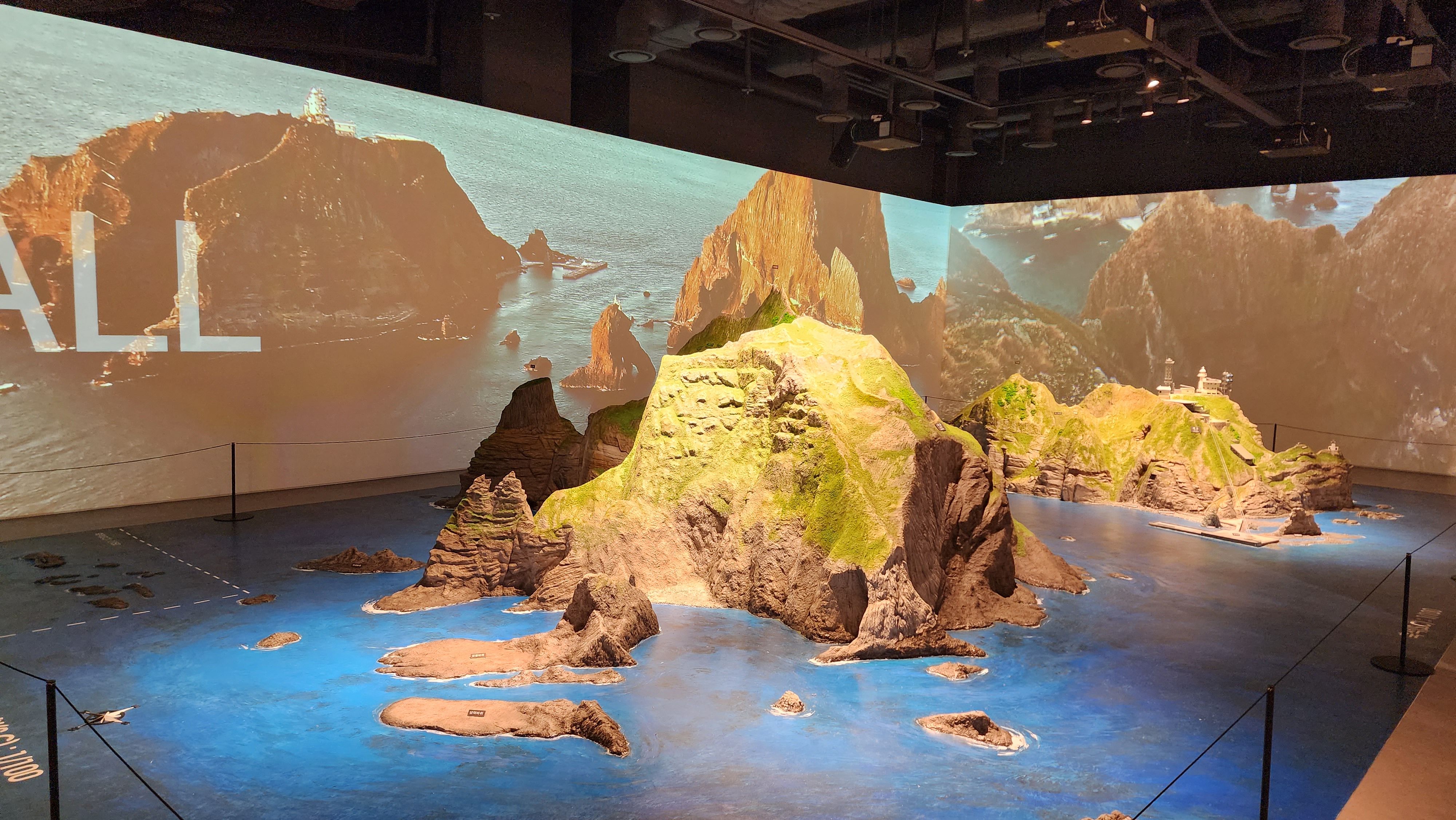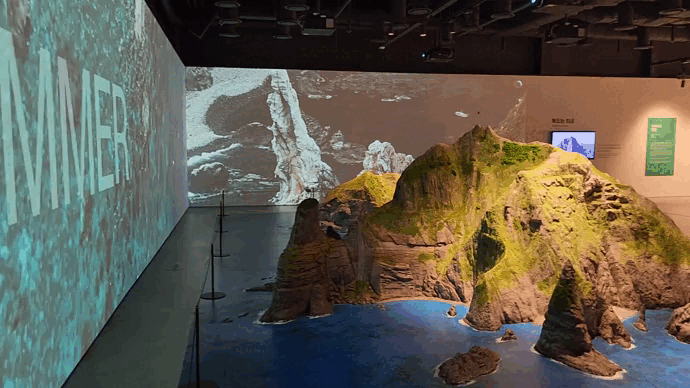 여기까지 모두 지나면 독도 조감도와 독도 모형이 나온다. 나는 이 공간이 참 멋있었다. 독도의 봄/여름/가을/겨울을 진짜 멋있는 영상으로 보여주고, 실시간 독도 모습까지 확인할 수 있다.