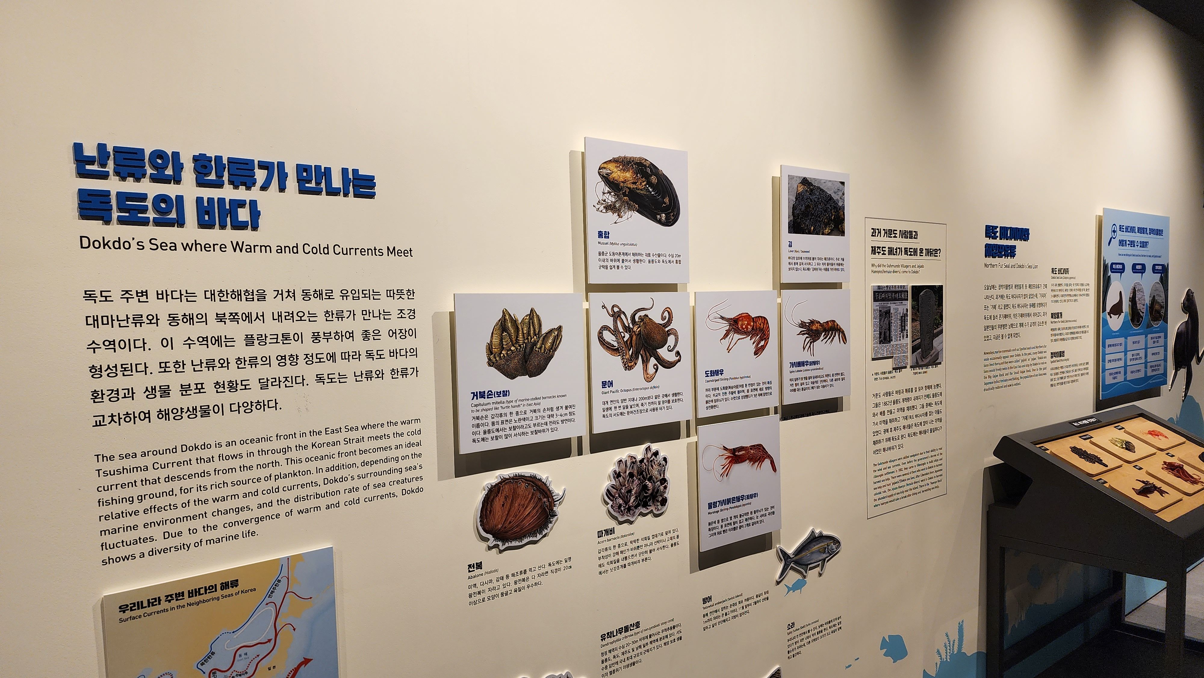 그리고 그 옆으로 독도의 생물들을 볼 수 있다. 아이들은 아마 이 공간을 제일 좋아하지 않을까 싶다. 독도의 바다에서 어떤 생물들이 자라는지 이미지와 모형으로 확인 가능하다.