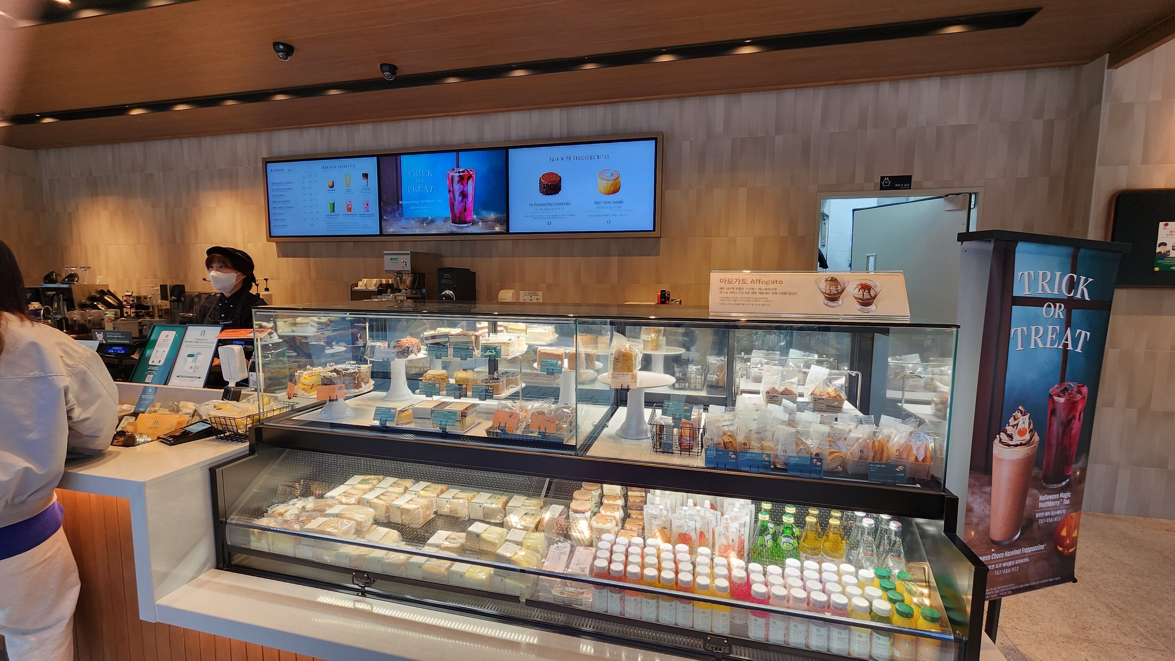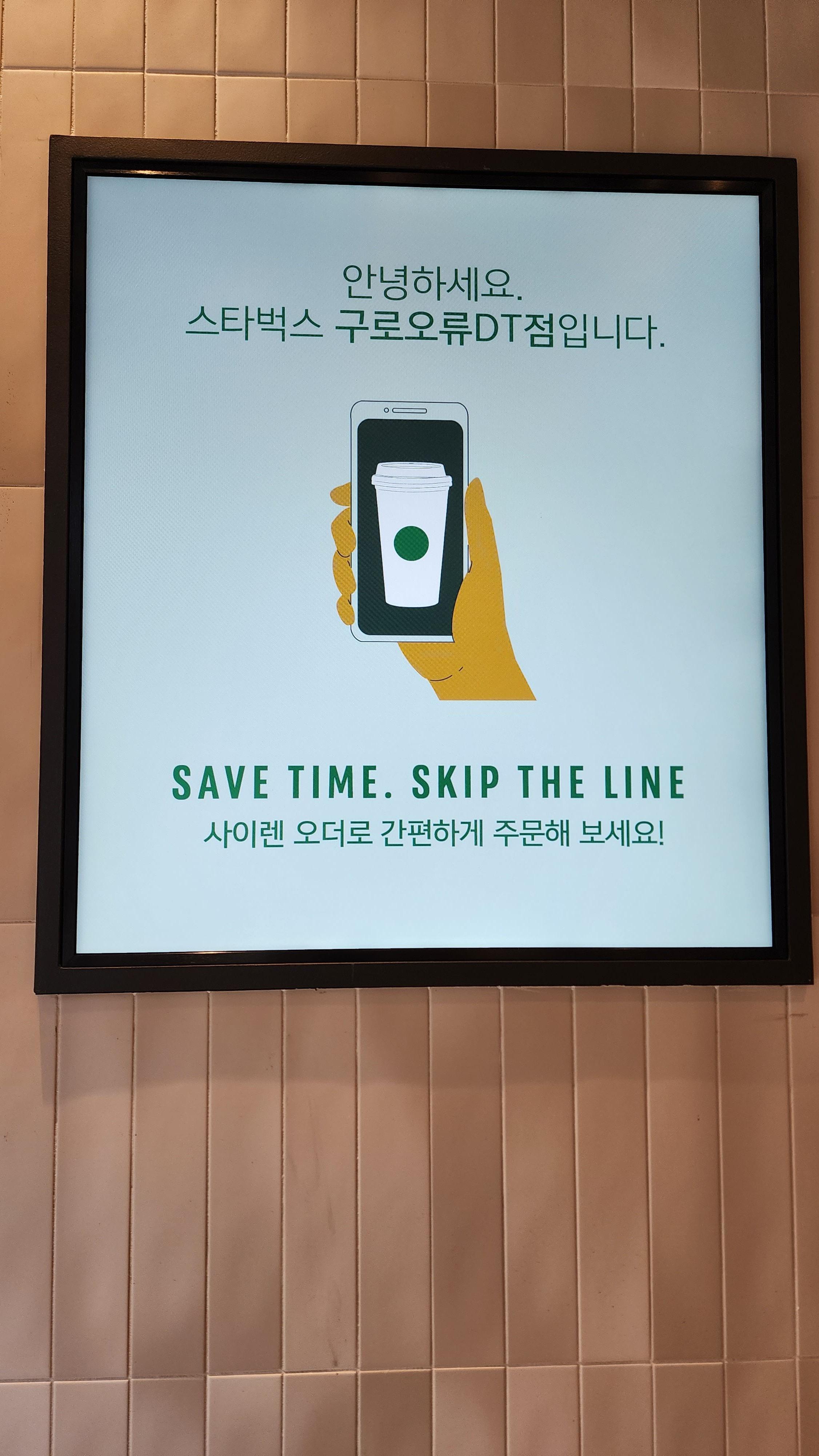 새 거라서 그런지 여기는 전광판이 다른 곳과 좀 다르다. 나무판자 갈아 끼우는 것 같은 기존 스타벅스에서 보이는 그런 메뉴판은 없고 다 전광판으로 되어있다.
