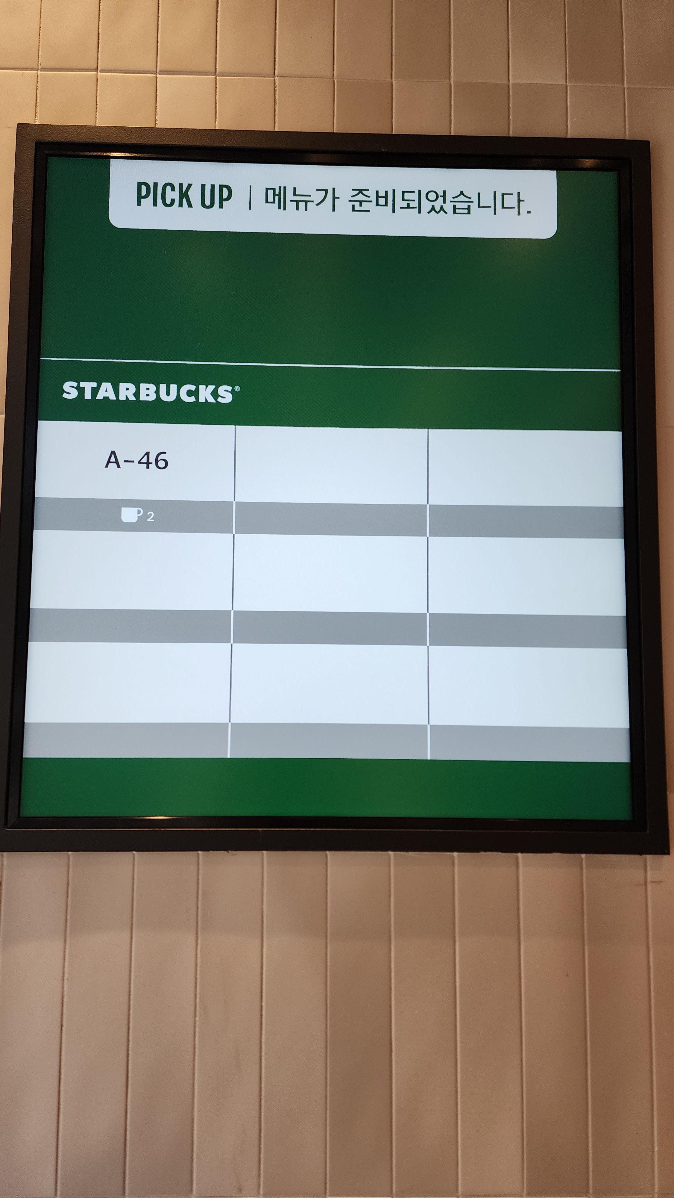 또 신기했던 건 여기! 여기는 음료가 주문이 완료되면 벽에 붙은 큰 전광판에서 메뉴를 확인할 수 있다. 매 번 픽업대 앞 작은 전광판과 직원분의 목소리를 통해 확인할 수 있었는데 이런 면에서는 무척 편리해 보였다.