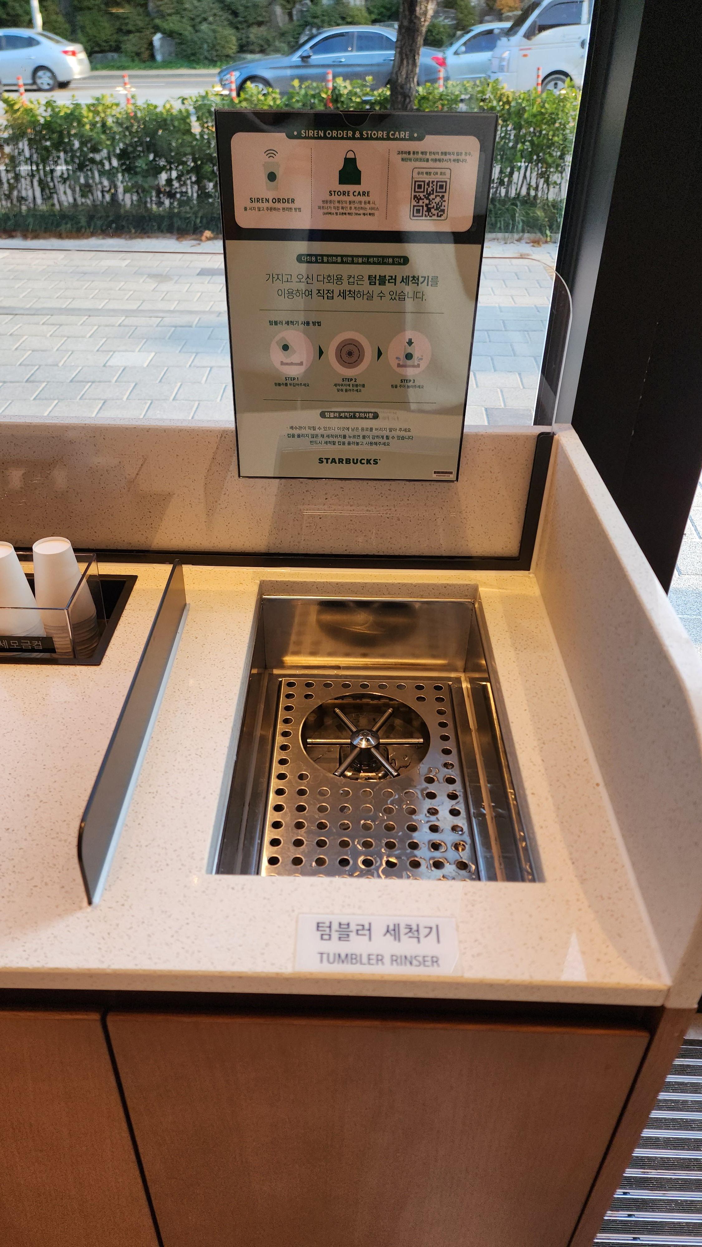 그리고 또 신기했던 거 텀블러세척기가 바깥쪽에 마련되어있다. 이런 게 다른 스타벅스에도 있겠지만 나는 여기서 처음봐서 신기했다. 나도 텀블러를 이용해 음료를 주문한 적이 있는데 아무리 집에서 깨끗하게 씻고 가도 일정 시간이 지난 후 카페에서 주문을 할 때면 그래도 한 번쯤은 씻어서 음료를 받고 싶다는 생각을 할 때가 있는데 그럴 때도 매우 유용하게 쓰일 것 같았다👍