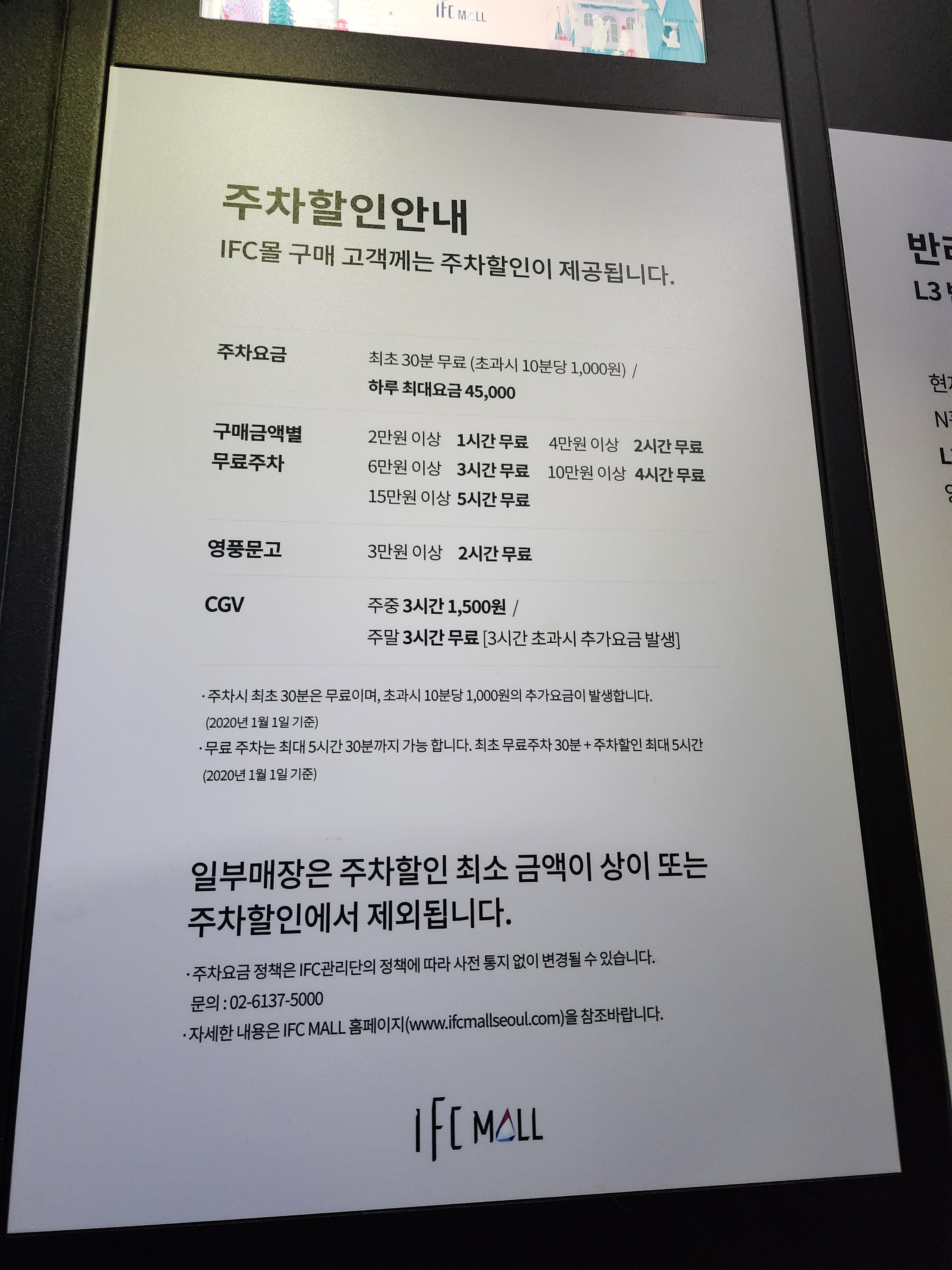 ifc몰 주차요금은 아래와 같다. 최초 30분은 무료고 초과 시 10분당 1,000원이다. 구매금액별 무료 주차를 받을 수 있으니 물건을 구매하시면 꼭 주차할인 챙기시길 바란다. 할인권을 주는 게 아니라 매장에서 주차할인"등록"을 해야 적용이 되니 꼭! 잊지 마시길😆