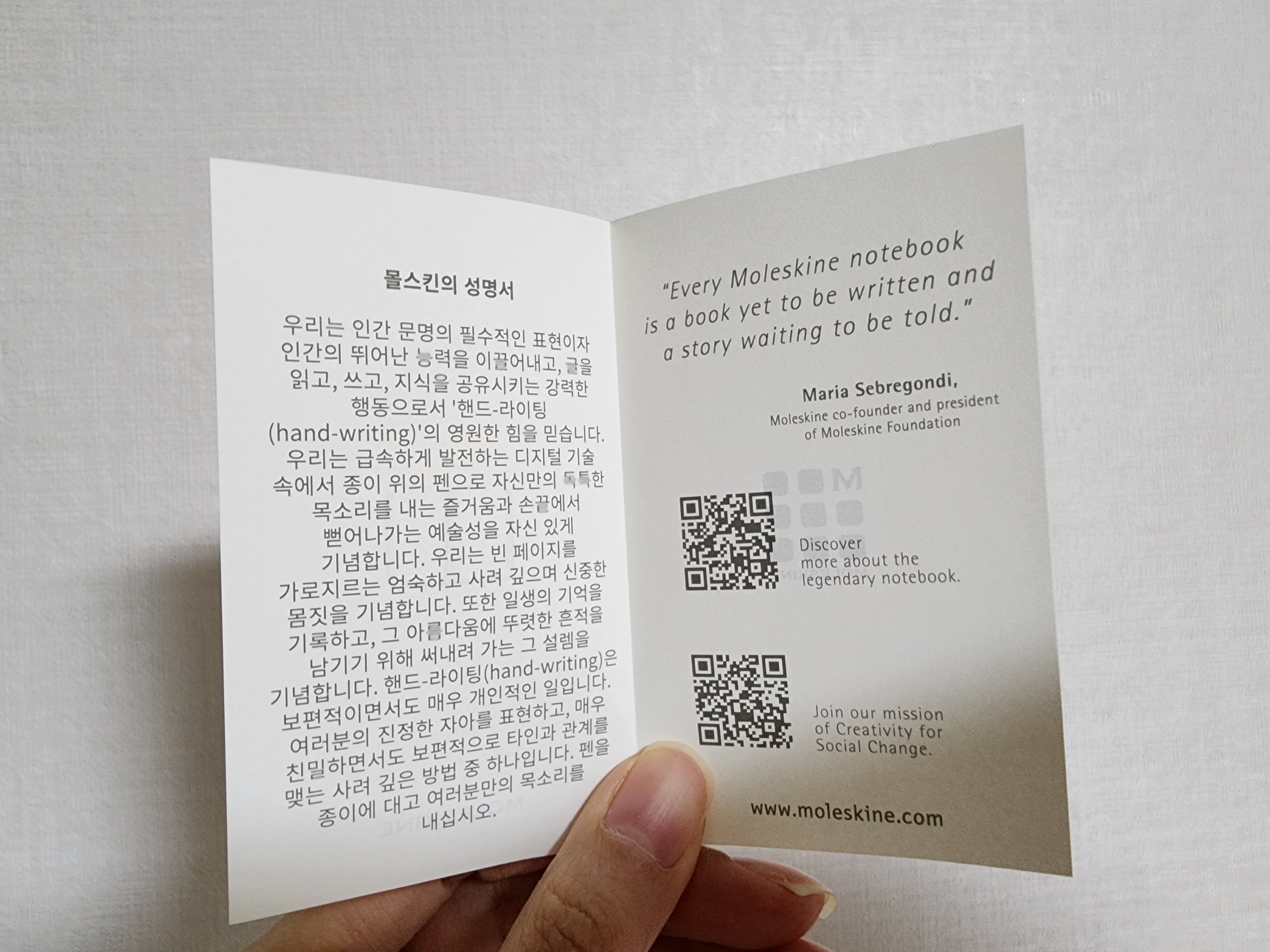 해당 다이어리는 몰스킨과 제휴를 맺어서 만든 제품이라 몰스킨에 대한 간단한 안내서도 같이 들어있었다.