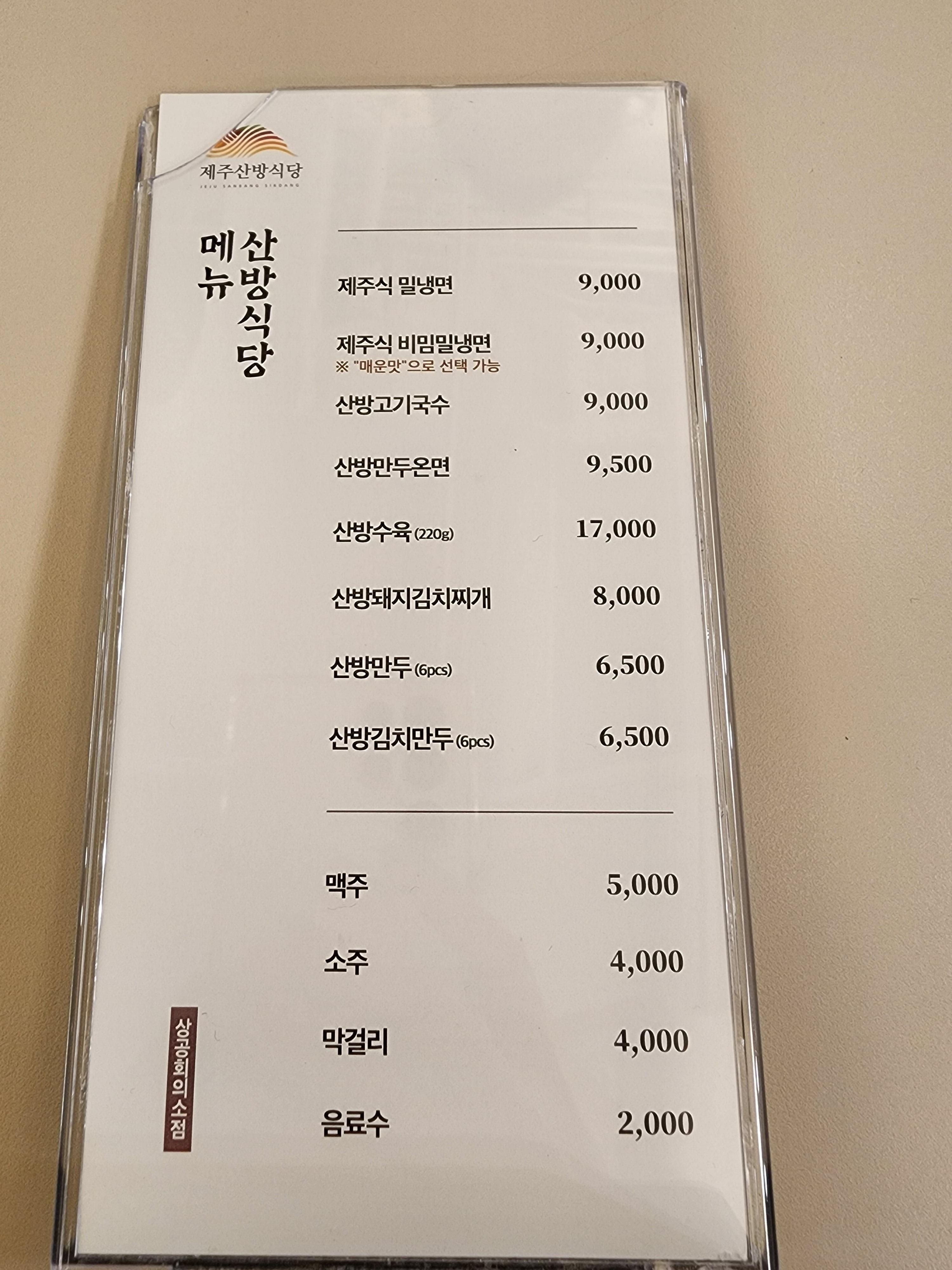 | 추천메뉴 | 1. 제주식 밀냉면 : 여름엔 무조건 이게 최고! 2. 산방만두온면 : 뜨뜻한 건 이게 최고! 3. 산방고기국수 : 먹어보기 괜춘! |