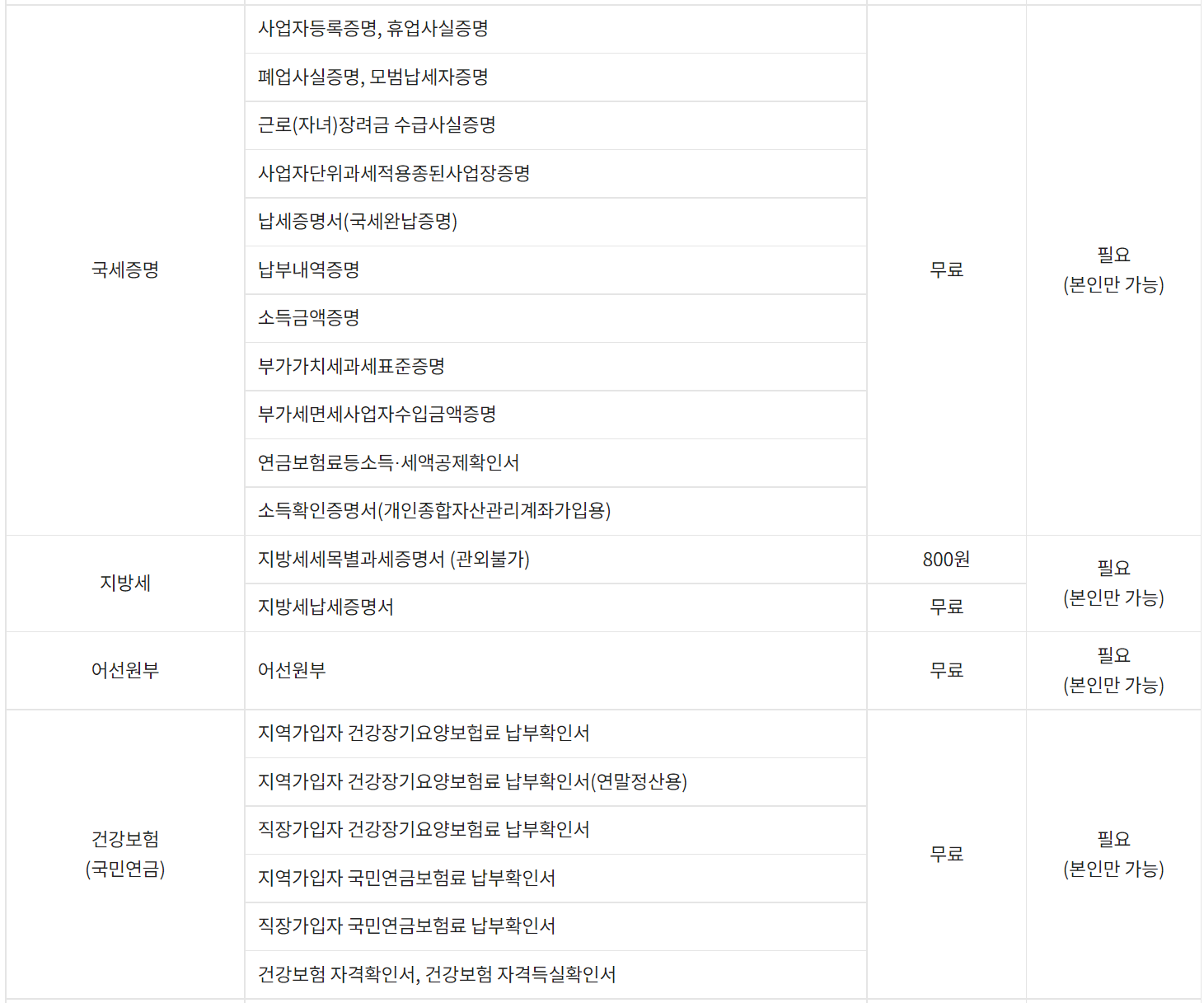 | 국세증명 | 사업자등록증명, 소득금액증명 | 무료 |