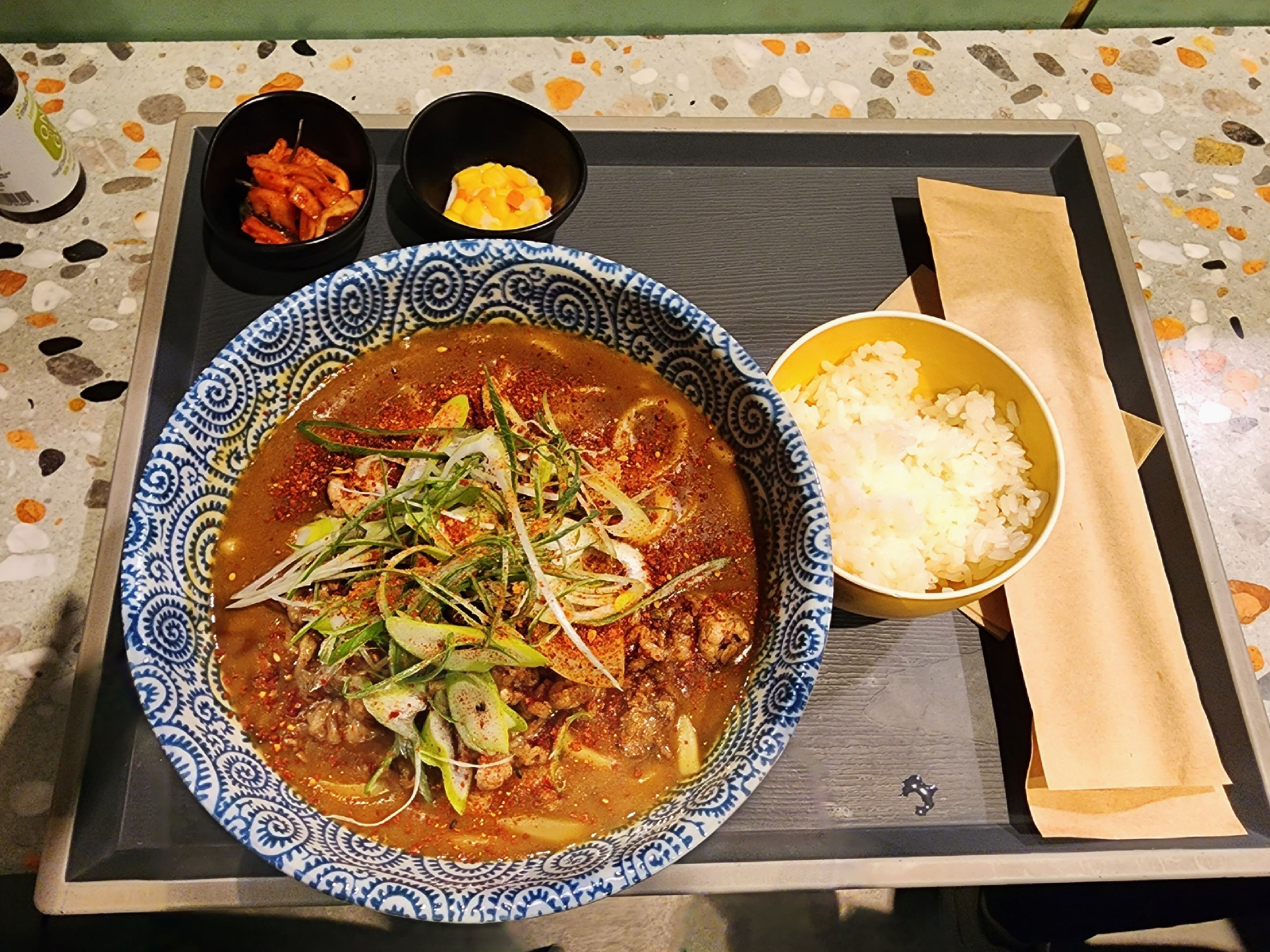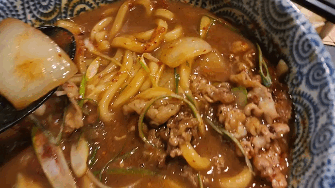 비주얼은 합격이긴 한데 생각보다 고춧가루가 너무 많이 뿌려져 있어서 놀랐다. 나는 대장절제술 후 매운 걸 거의 먹지 않아서 한 입 먹어보니 나에겐 좀 자극적이고 매운 느낌이 있었다. 혹시 매운 걸 싫어하시거나 조심해야 하는 분들은 고춧가루 덜 뿌려달라고 말씀하시는 게 좋을 것 같다. 예상컨대 들어있는 "우삼겹"이 약간 느끼한 맛을 낼 수 있어서 파랑 고춧가루를 엄~청 넣는 것 같다.