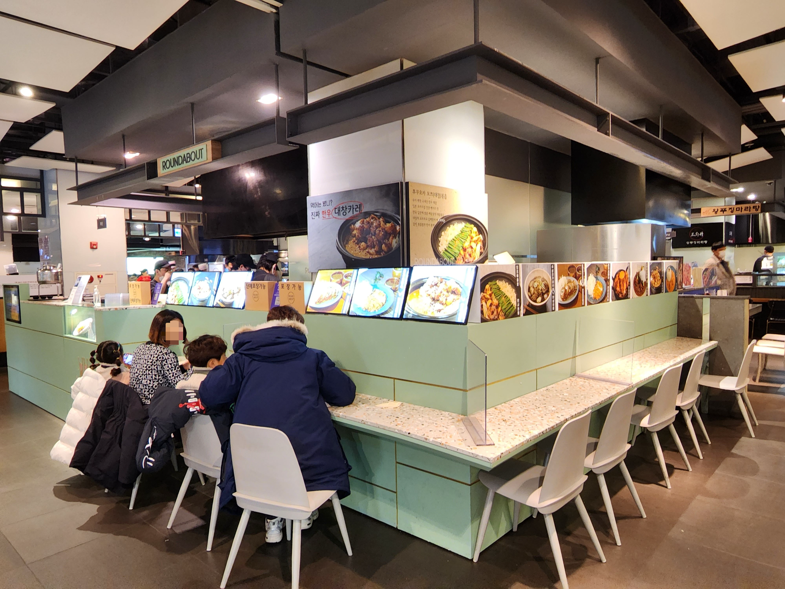 매장은 지하2층 푸드코트 있는 쪽에 위치해있다. 조리하는 곳을 중심으로 빙 둘러서 테이블이 있는 형태이다.