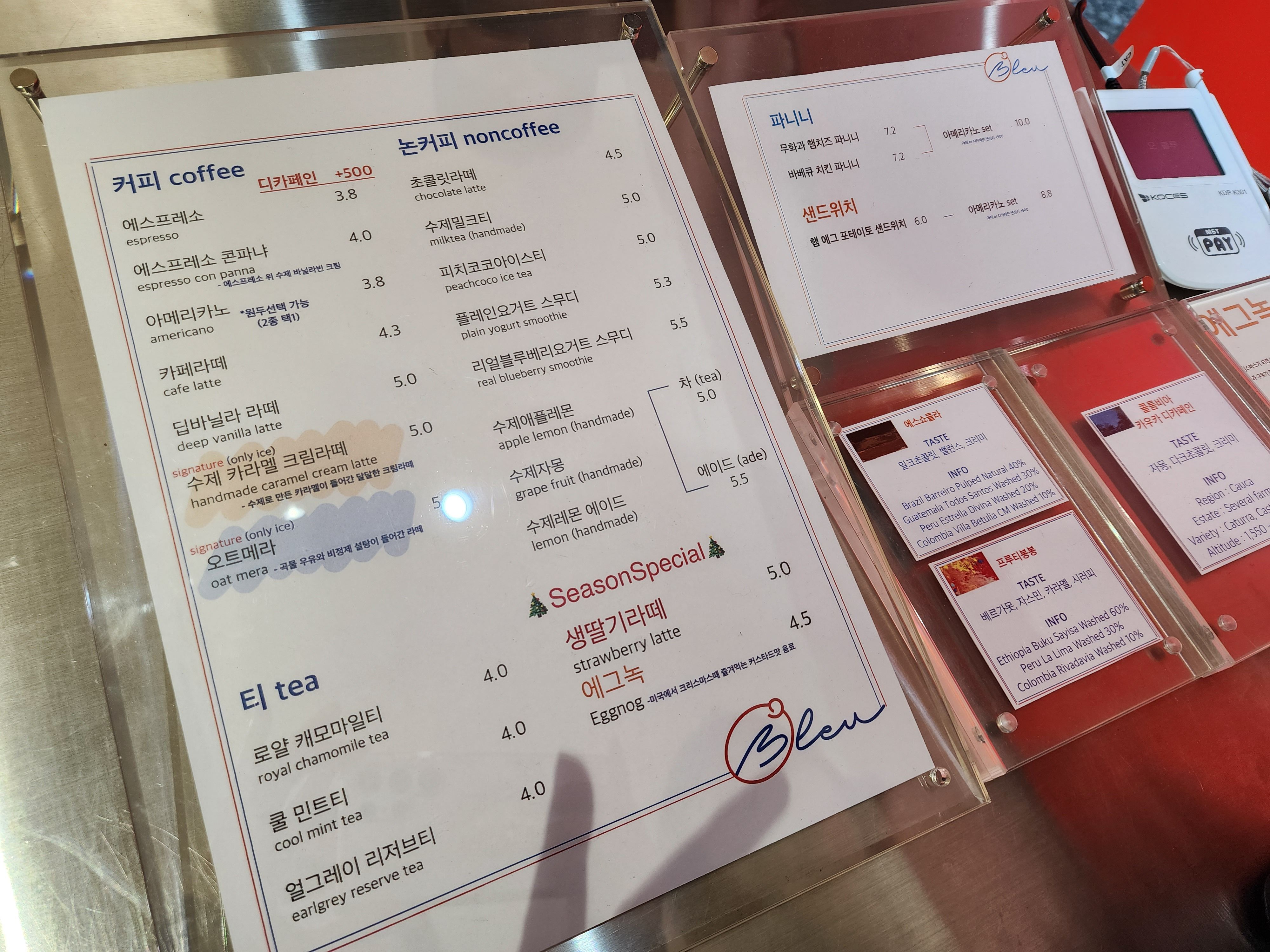 - 논커피 : 초콜릿라떼, 수제밀크티, 피치코코아이스티, 플레인요거트스무디 등