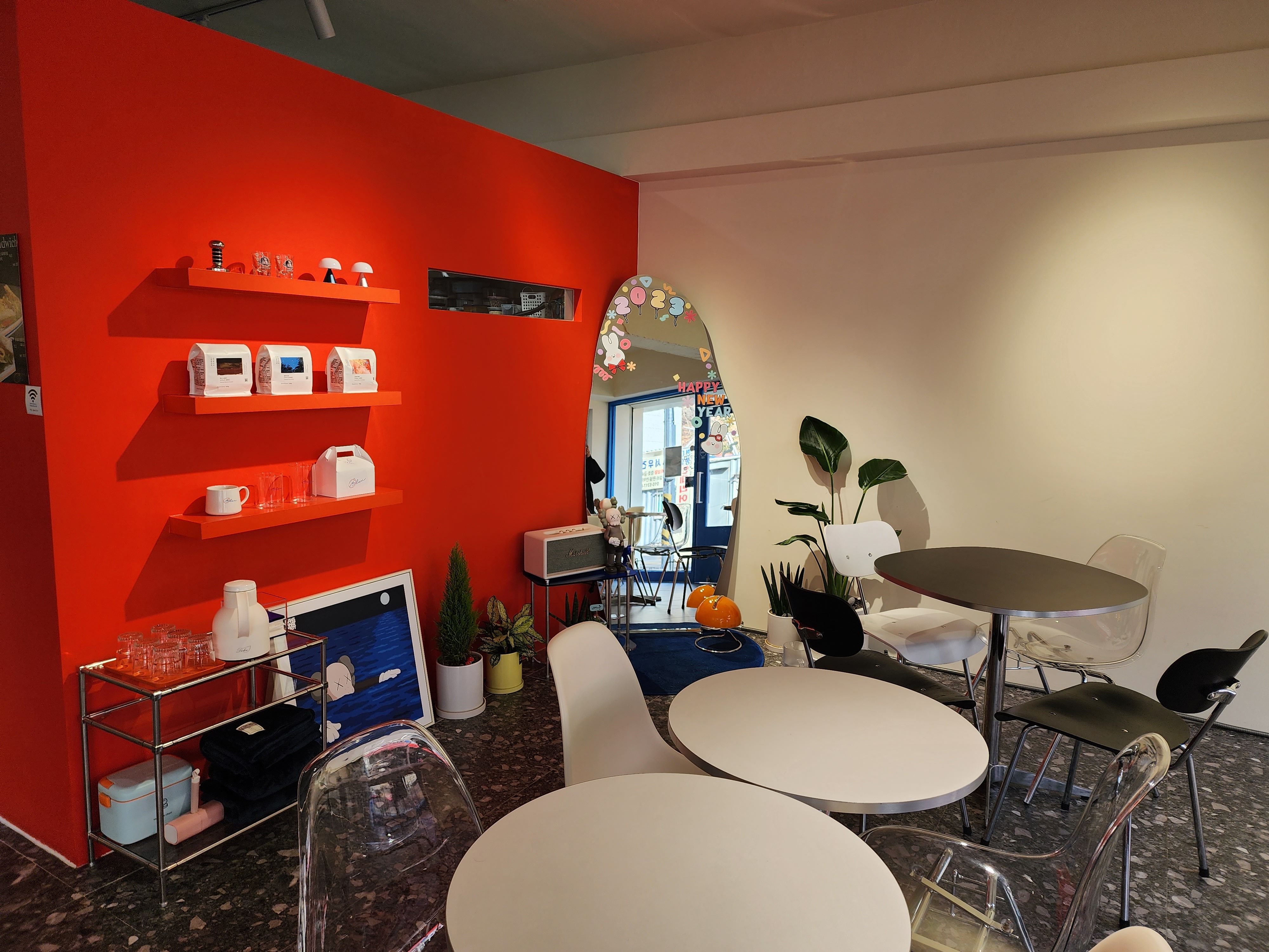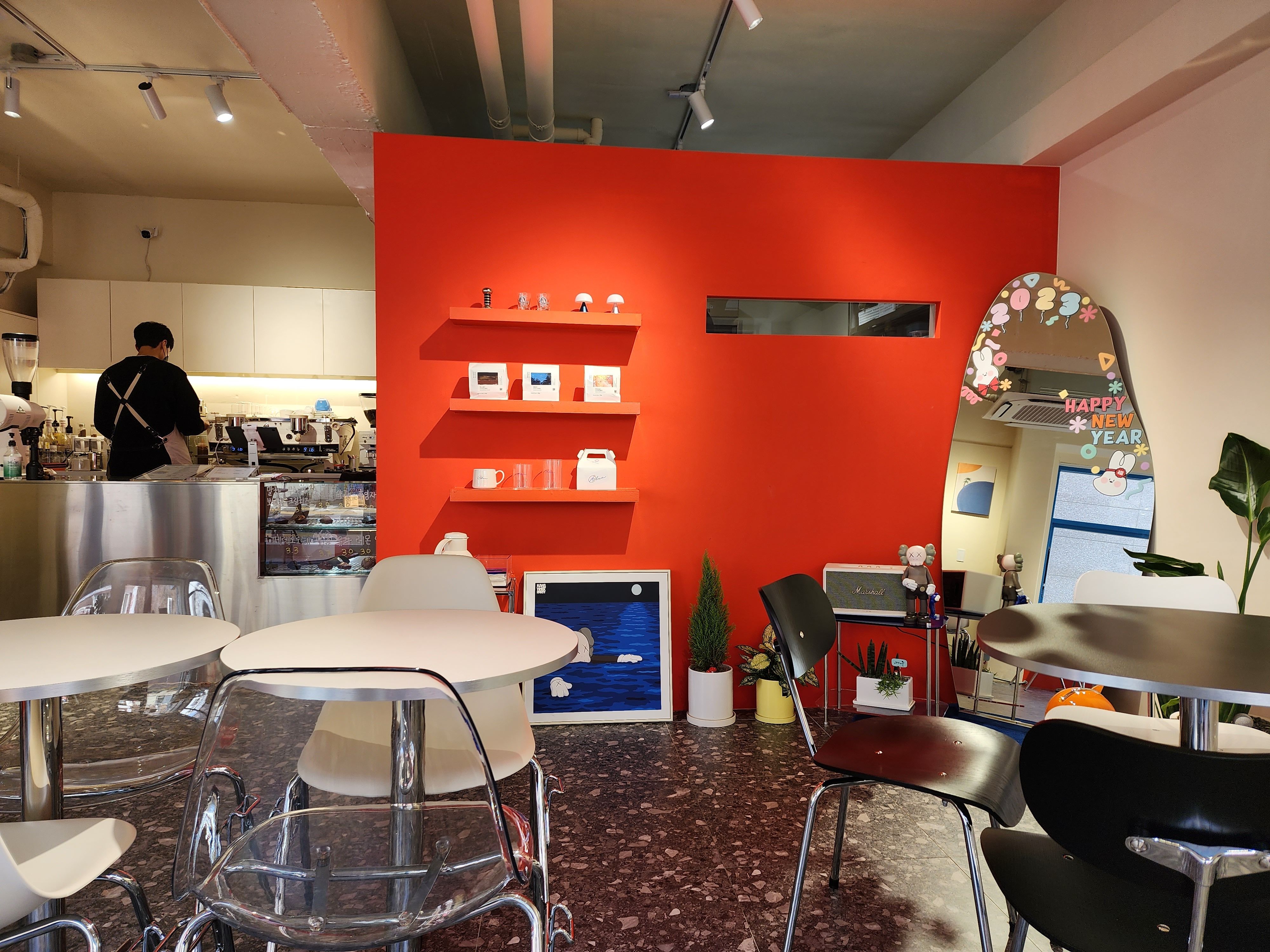 카페는 크지 않은데 깔끔하고 빨간색을 강조한 인테리어가 눈에 들어왔다. 가게 한쪽에는 큰 거울이 있어 누가 봐도 "인증샷용이구나!" 싶었다.