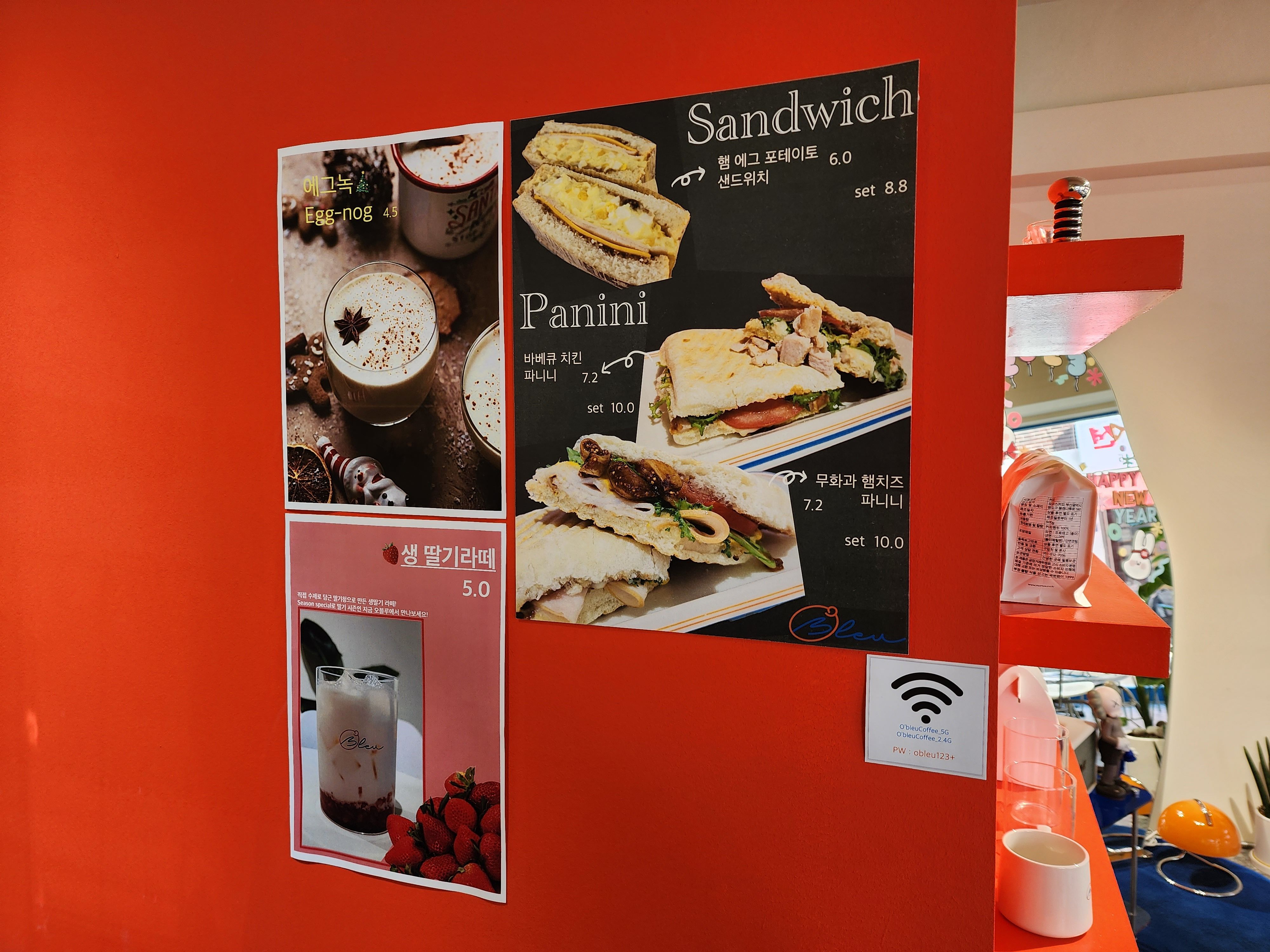 - 베이커리 : 무화과 햄치즈 파니니, 햄 에그 포테이토 샌드위치 등