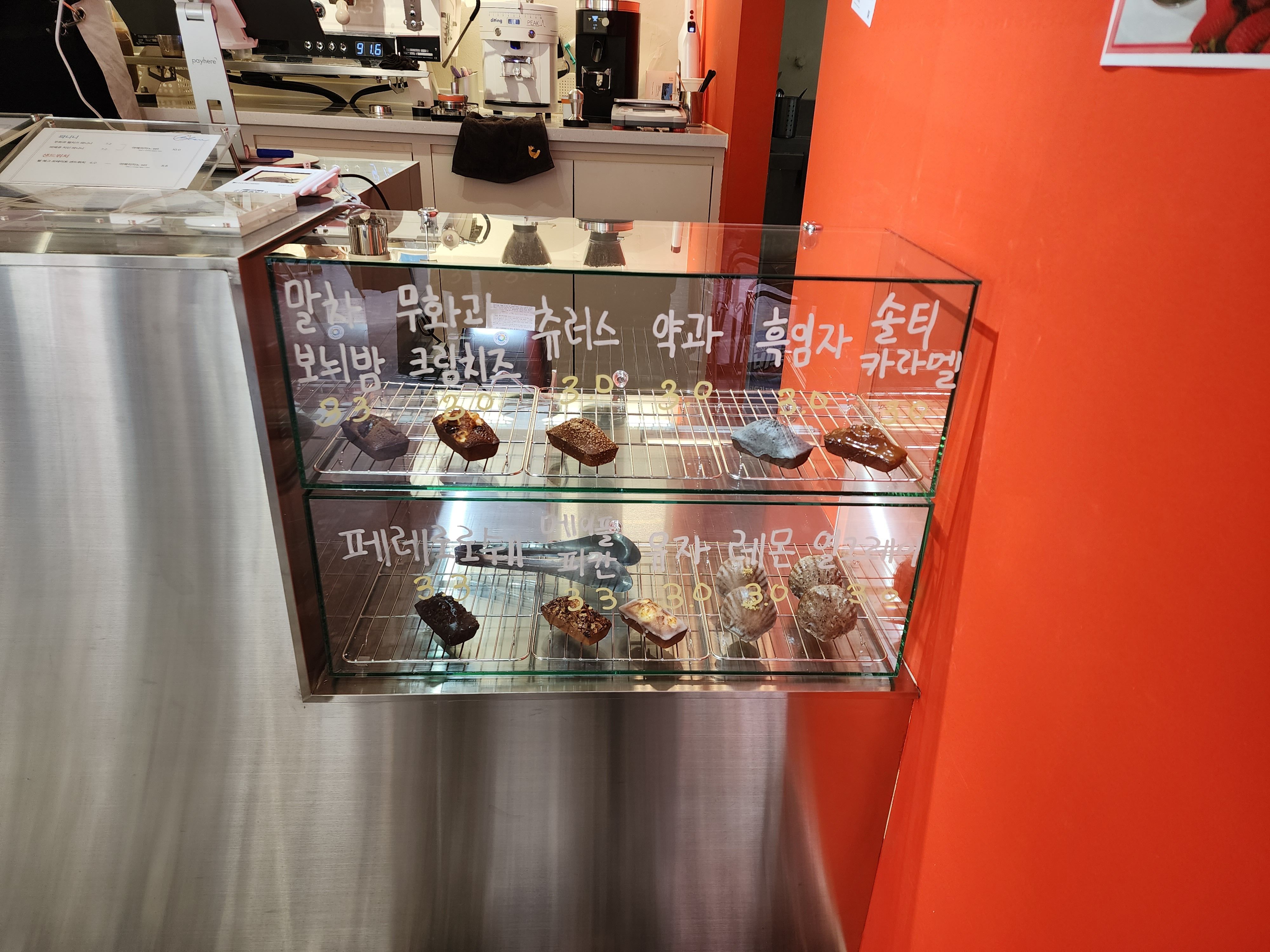 베이커리도 이렇게 눈으로 확인할 수 있었는데 휘낭시에, 마들렌 종류가 다양했다. 말차 보늬밤, 무화과 크림치즈, 츄러스, 솔티 카라멜, 메이플피칸 진짜 모~~두 맛 없을 수 없는 맛!