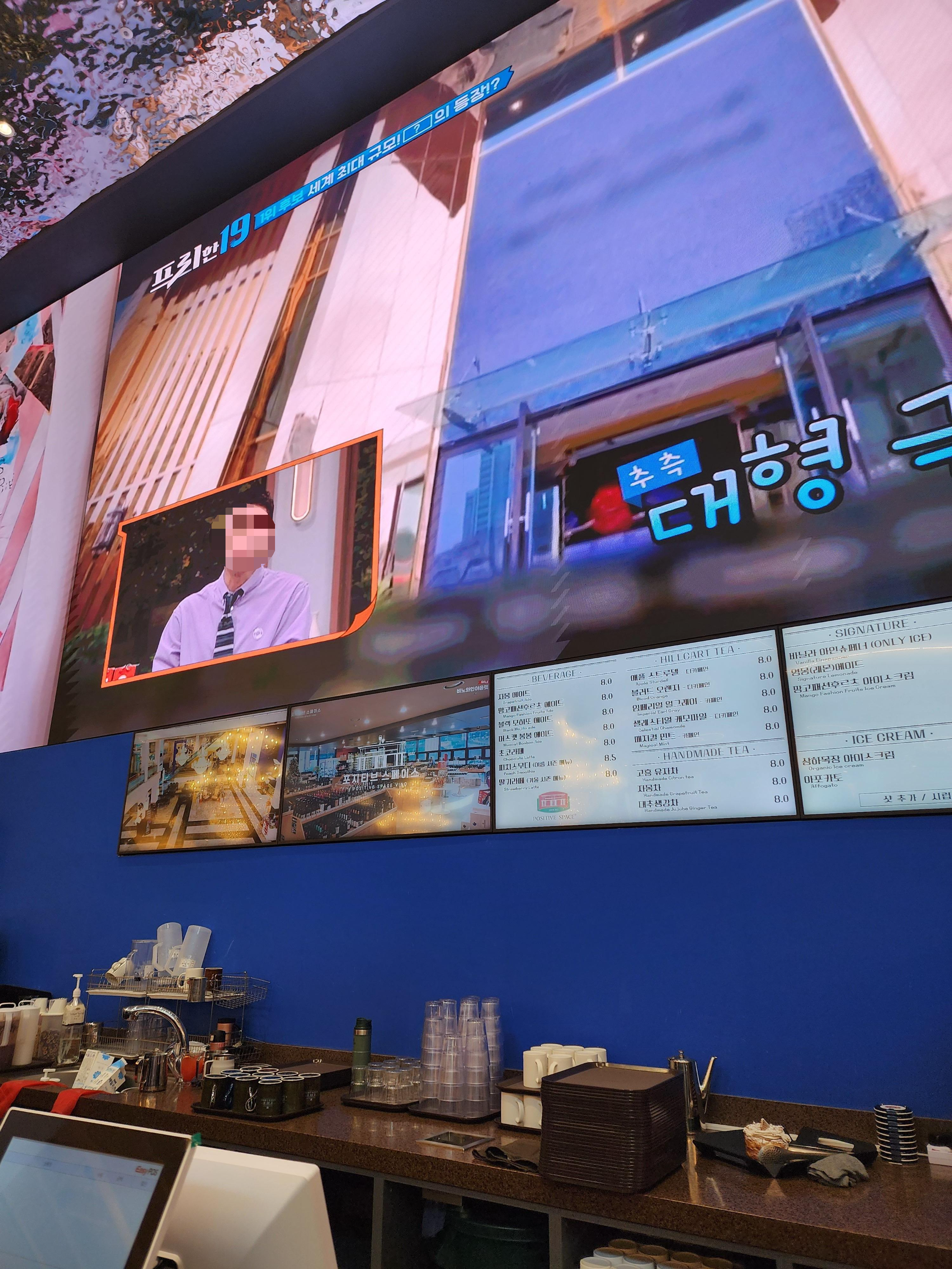 우리나라에서 가장 큰 카페라 '프리한19' 방송에도 나왔다고 한다. 엄청나게 큰 스크린에 이 화면이 계속 나오고 있었다.