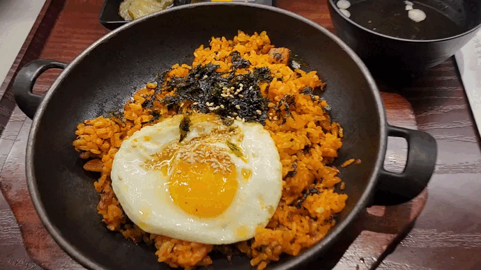 내가 시킨 차돌깍두기볶음밥도 먹어보았다. 일단 맛 자체는 매우 맛있었다. 맛있는 이유에는 여러가지가 있겠지만 내 생각에는 기름을 꽤 많이 넣어서 그 후식 볶음밥 눌러진 부분처럼 바삭한 맛이 나서가 1가지 이유로 보였다. 그래서 그런지 맛은 있지만 나에게는 약간 기름진 느낌이 들었다. 하지만 전반적으로는 만족!