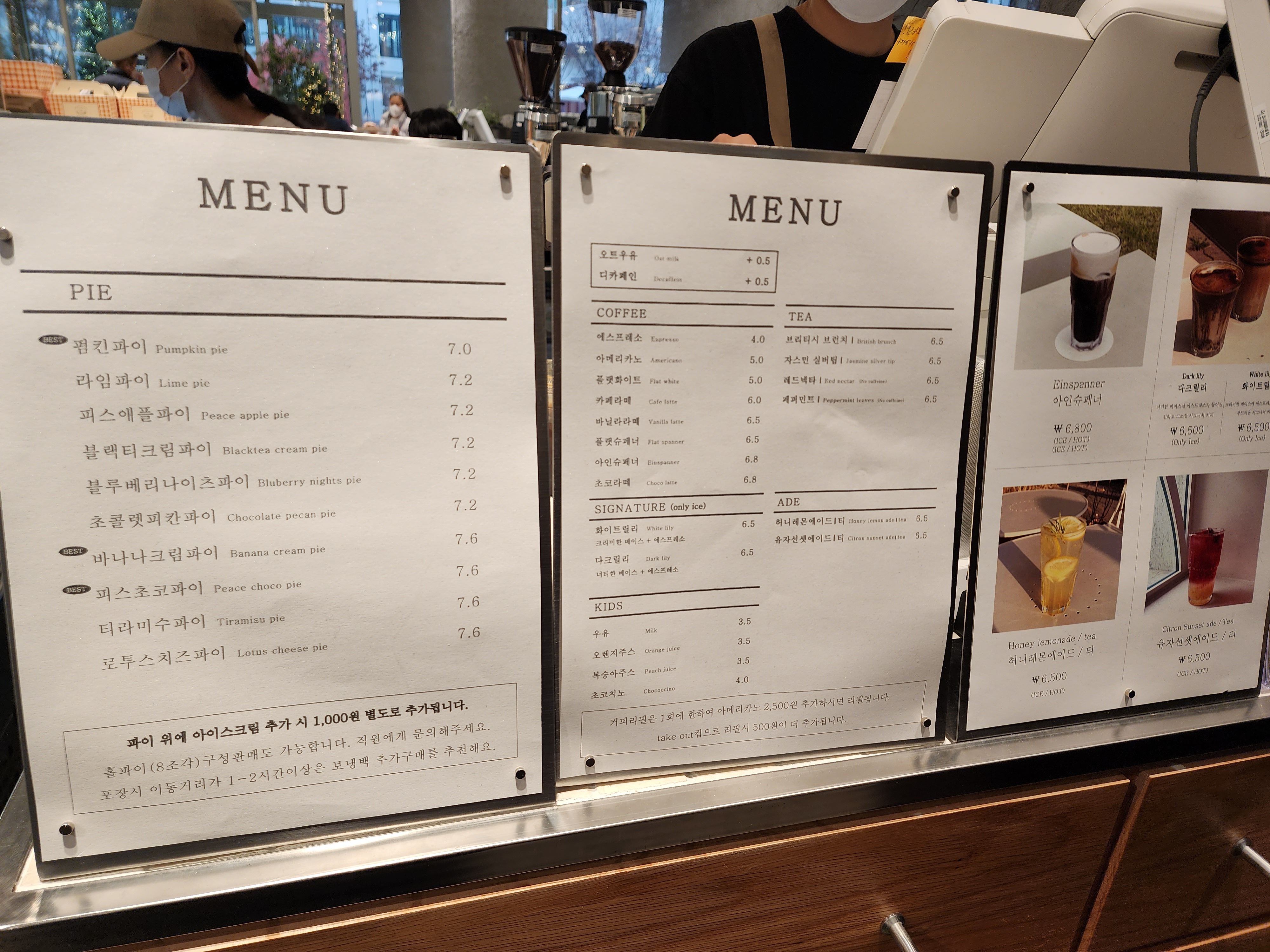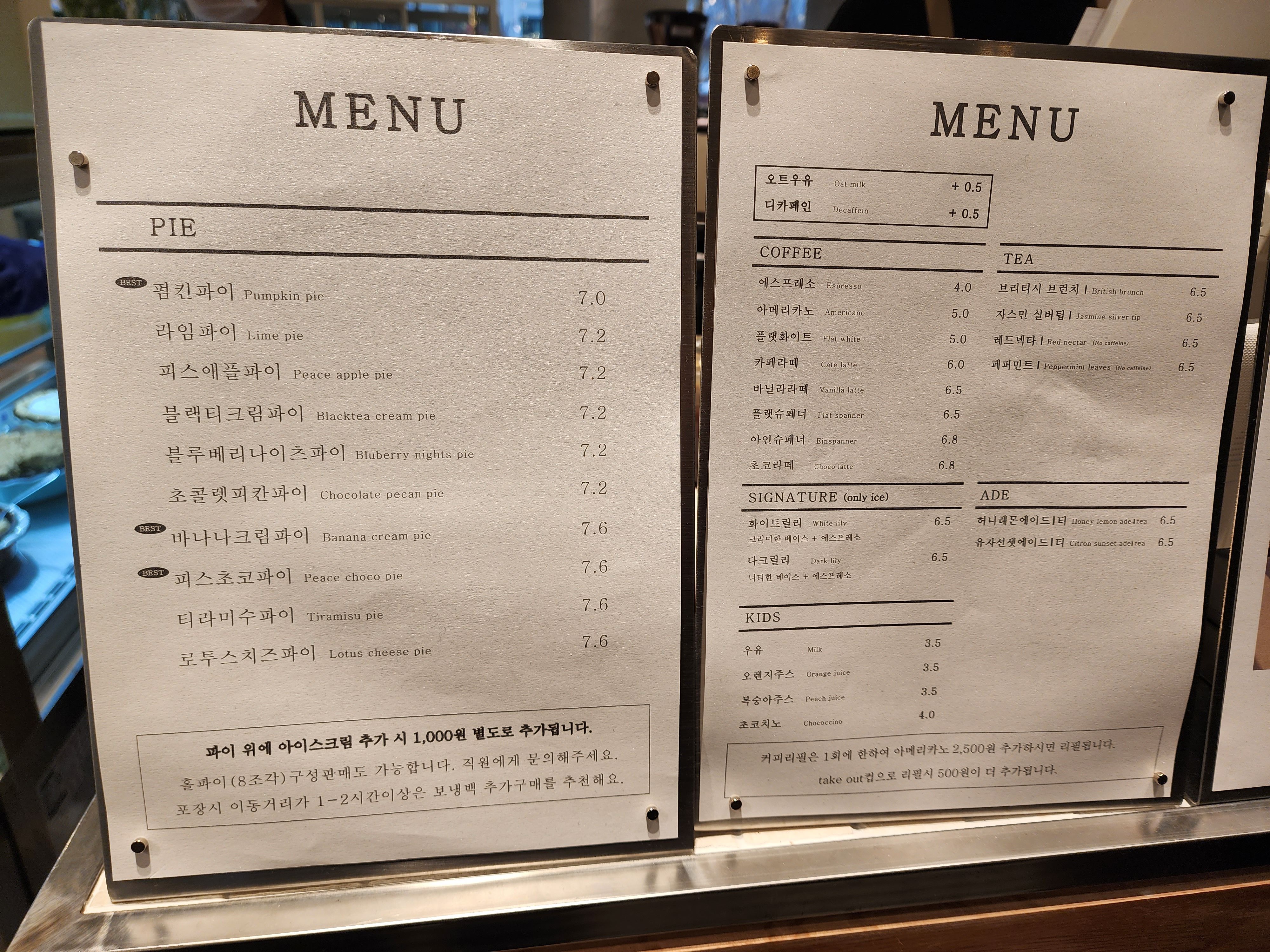 피스피스는 파이 맛집이지만 음료도 꽤 괜찮아 보였다. 무엇보다 커피와 우유 잘 못먹는 나에게 매우 적합한 "오트우유", "디카페인" 변경이 가능해서 다음에는 음료도 꼭 먹어보고 싶었다.