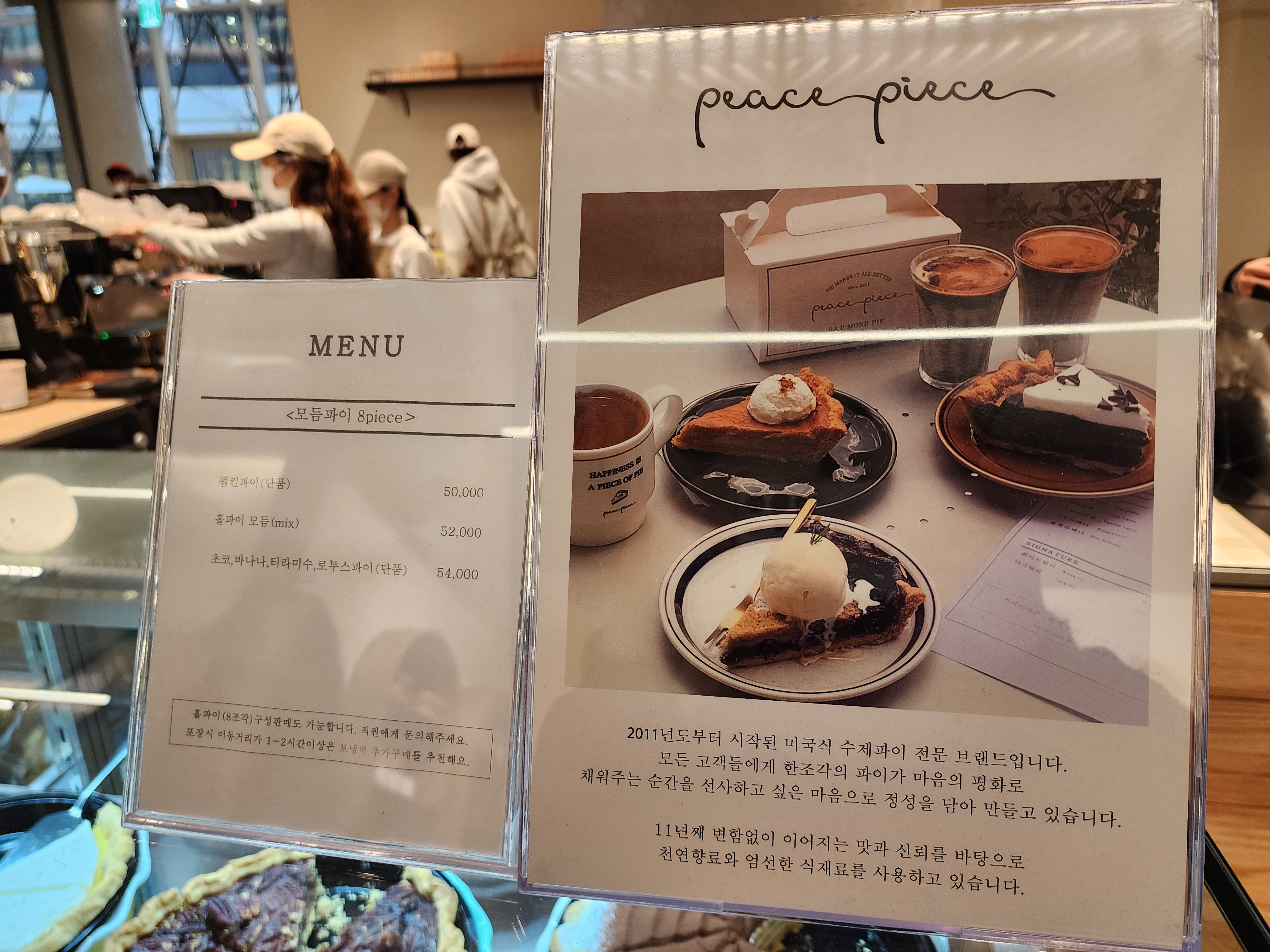 남양주 현대아울렛 스페이스원에서 쇼핑을 마치고 음료 한 잔 먹으려고 1층에 있는 카페를 쭉 돌았다. 그러다가 발견한 "피스피스". 처음 보는 브랜드였는데 파이가 너무 맛있어 보여서 포장해서 집에 와서 먹기로 했다. 가격이 1조각에 7,000원이 넘어가서 평소라면 안 먹었겠지만 엄마랑 오랜만에 나온 쇼핑이라 새로운 거 한 번 먹어보자!라는 마음으로 큰맘 먹고 샀는데 결과적으로는 나도 엄마도 너무 맛있게 먹어서 소개해드리려고 한다.