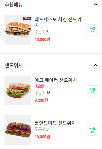 - 샌드위치 : 에그 베이컨 샌드위치, 플랜트미트 샌드위치, 레드페스토 치킨 샌드위치