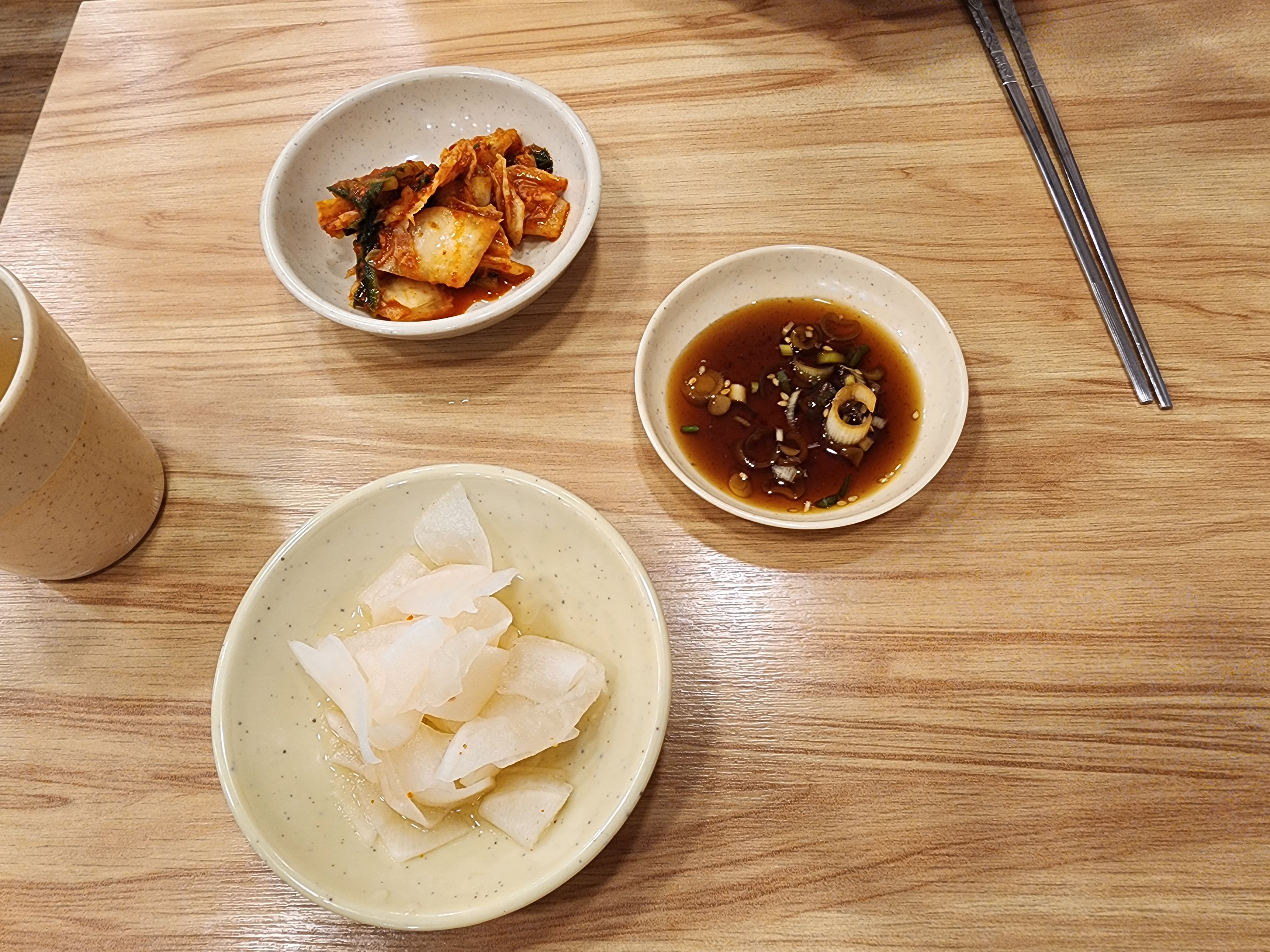 김치, 무 밑반찬이 나오고 빈대떡을 시켰기에 간장을 주셨다.