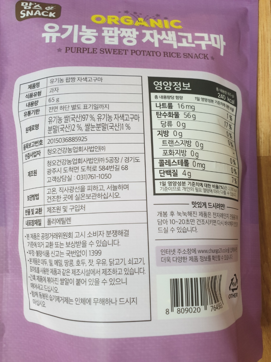 ② 자색고구마 : 유기농 쌀(국산) 97%, 유기농 자색고구마 분말(국산) 2%, 쌀눈분말(국산) 1%