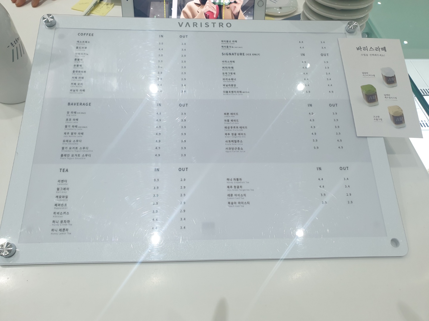 - 커피 : 콜드브루, 아메리카노, 롱 블랙, 숏 블랙, 플랫화이트, 바닐라 라테 등