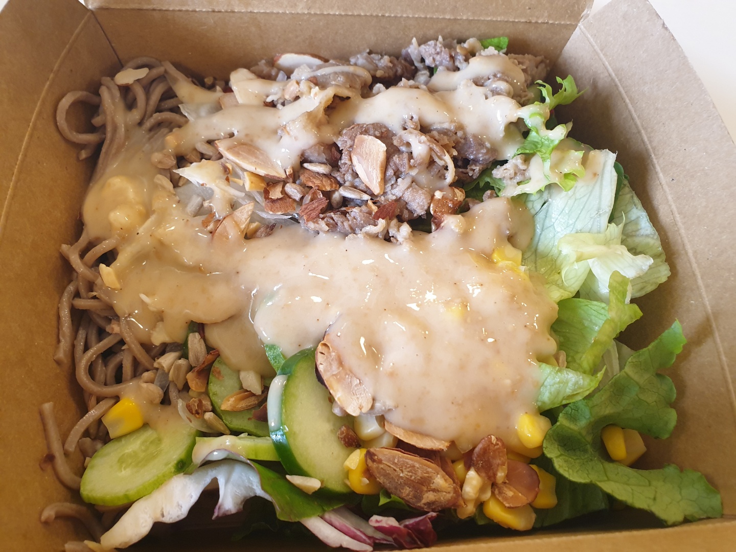 - 구성 : 우삼겹, 메밀면, 오이, 옥수수, 양파, 견과류 (추천 드레싱 : 오리엔탈)